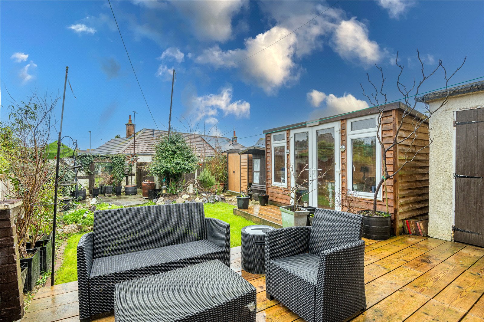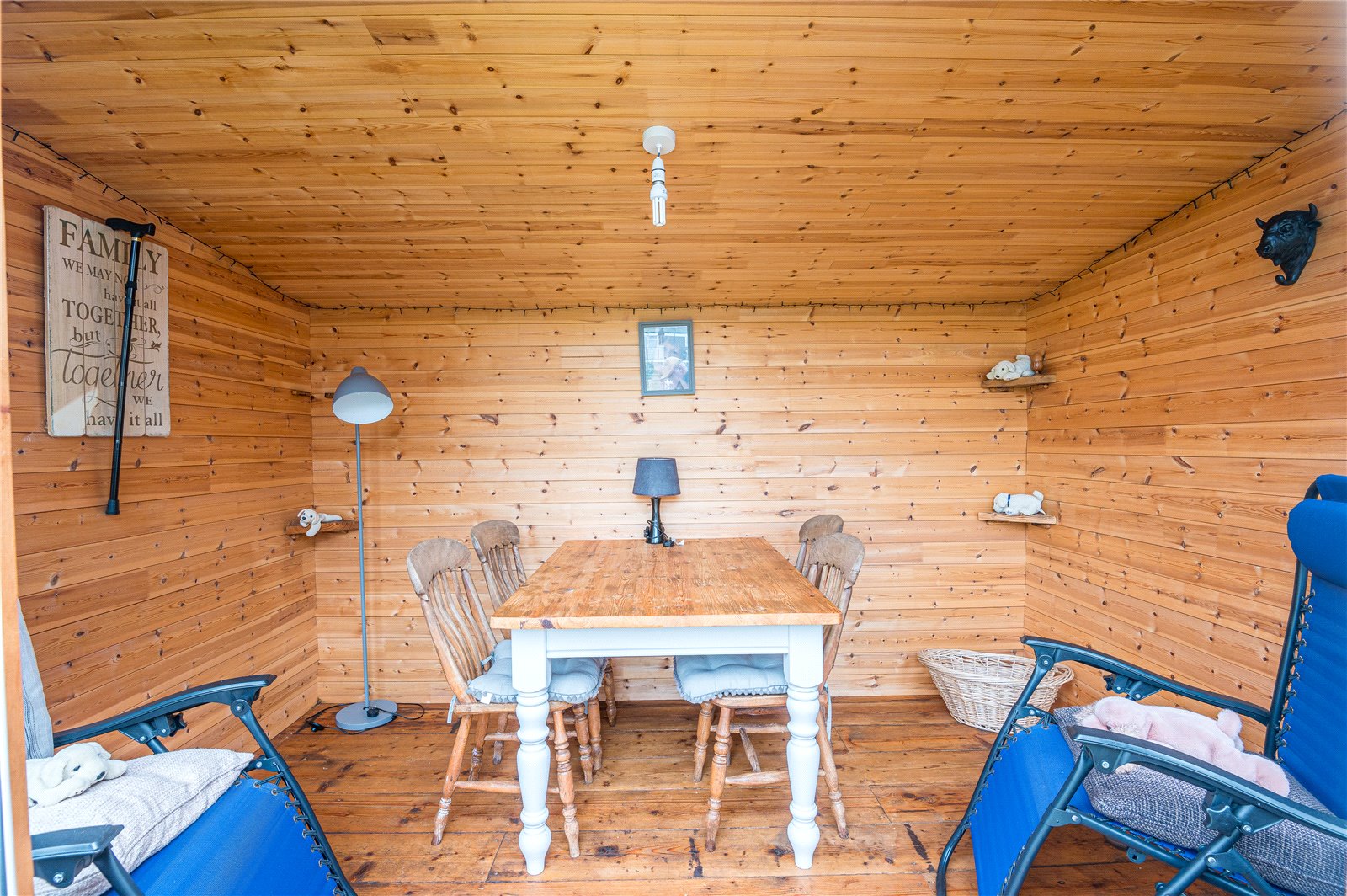 The well proportioned rear garden commences from the dining room and outer lobby, with a full width decked patio terrace ideal for dining al fresco. Brick built barbecue. The patio terrace extends to a hardstanding for a detached garden lodge, with double glazed French doors to front and twin double glazed windows to front. Further external storage sheds. Expanse of lawn with brick bordered flower and shrub beds, and a further hardstanding suntrap patio terrace to the rear of the garden.