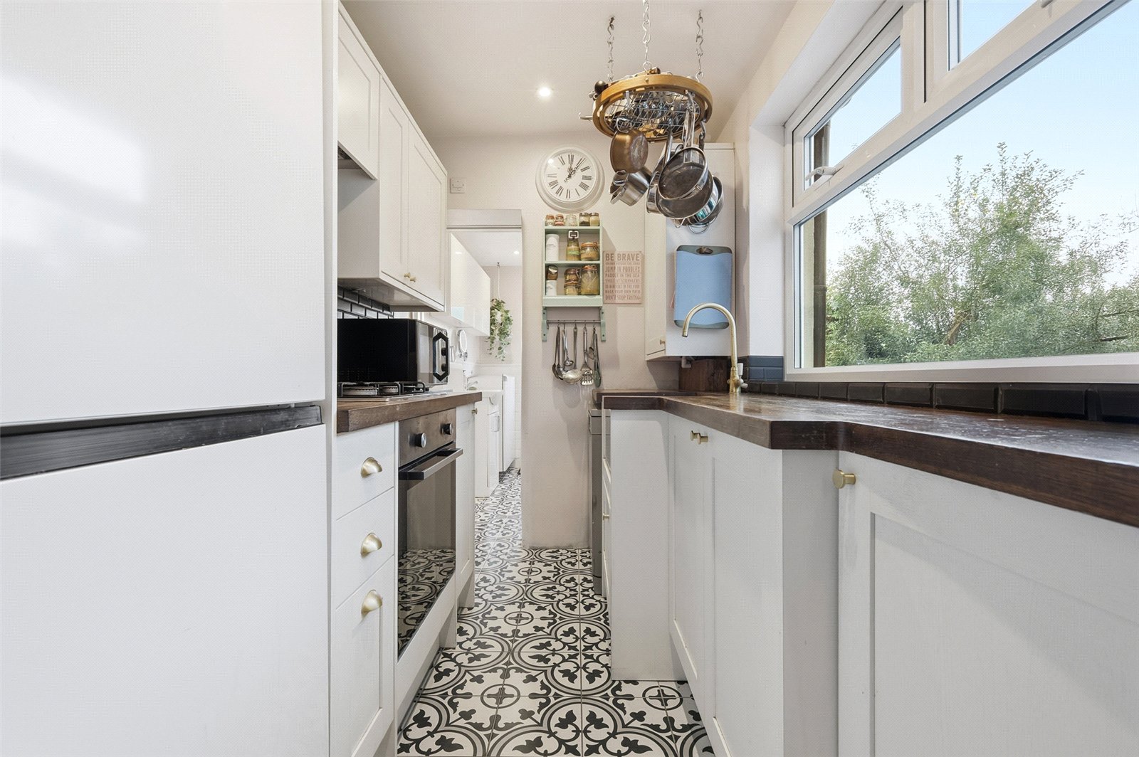 Upvc double glazed window to side. The kitchen has been professionally planned and fitted with a comprehensive range of base and pelmetted eyelevel cabinets in shaker style units with brass fittings, and stained oak working surfaces with recessed butler-style sink. The range of integrated appliances include split-level brushed steel fan-assisted electric oven with four-ring gas hob and concealed extractor canopy above, fridge and freezer. Designer metro tiled splashbacks with matching sill. Space, plumbing and drainage for dishwasher. Victorian tray tiled flooring. Smooth plastered ceiling with recessed LED lighting. Doorway through to: