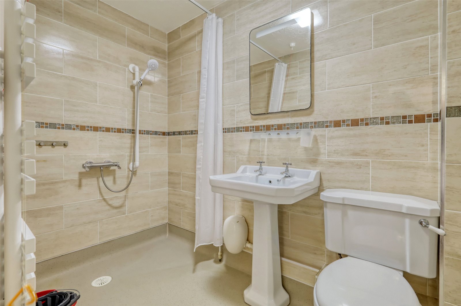 A fully tiled room with inset feature border tiles and anti-slip flooring, with electric heated towel rail. Open fronted power shower, pedestal wash handbasin, and close coupled WC. Wall light point. Extractor fan. Drop light switch.