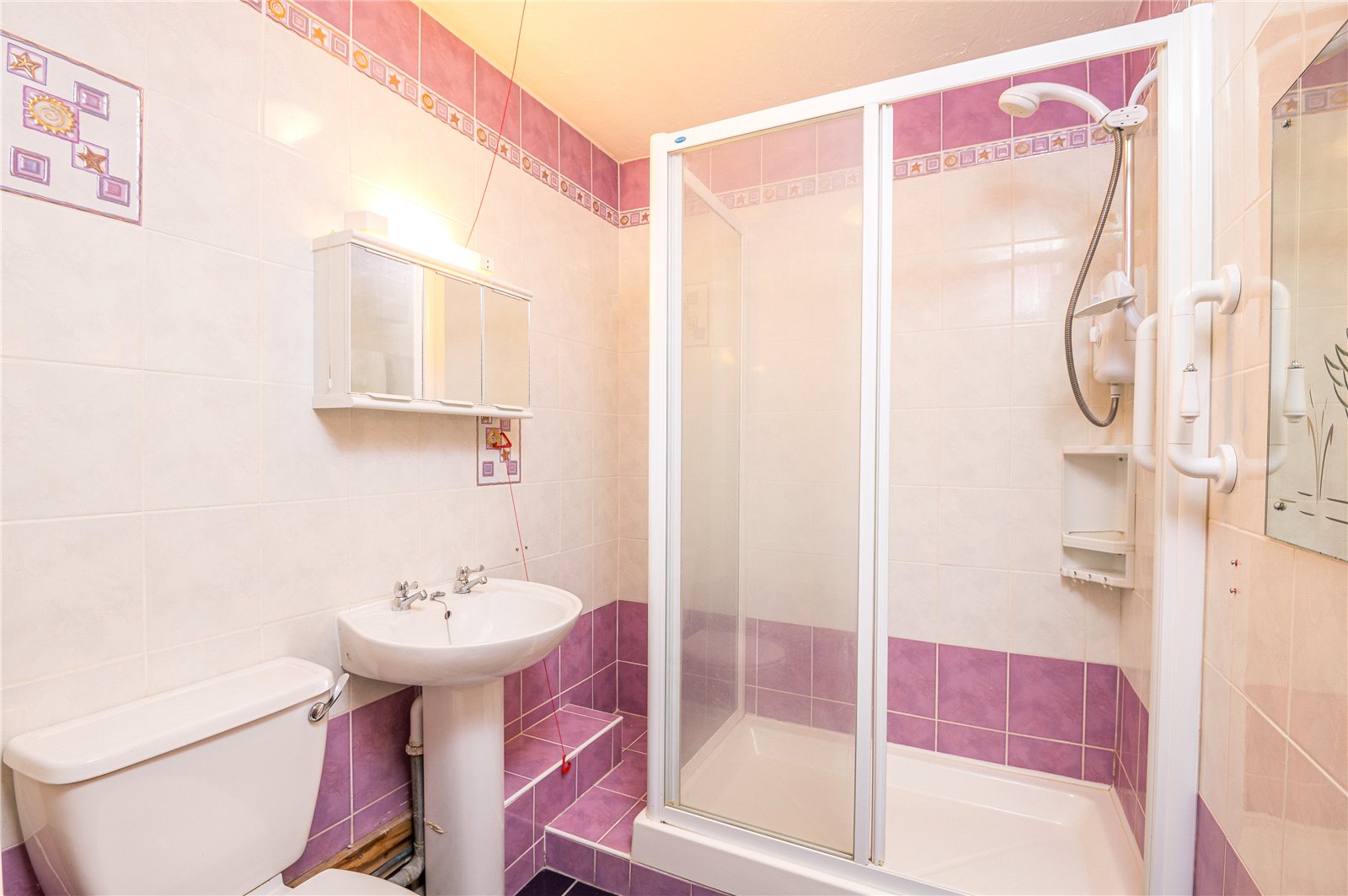 A modern refitted shower room comprising of double width shower enclosure with Triton electric shower, pedestal wash handbasin and close coupled WC. Full tiling to all walls, with inset picture and border tiles. Tiled floor. Wall mounted fan heater. Drop light switch.