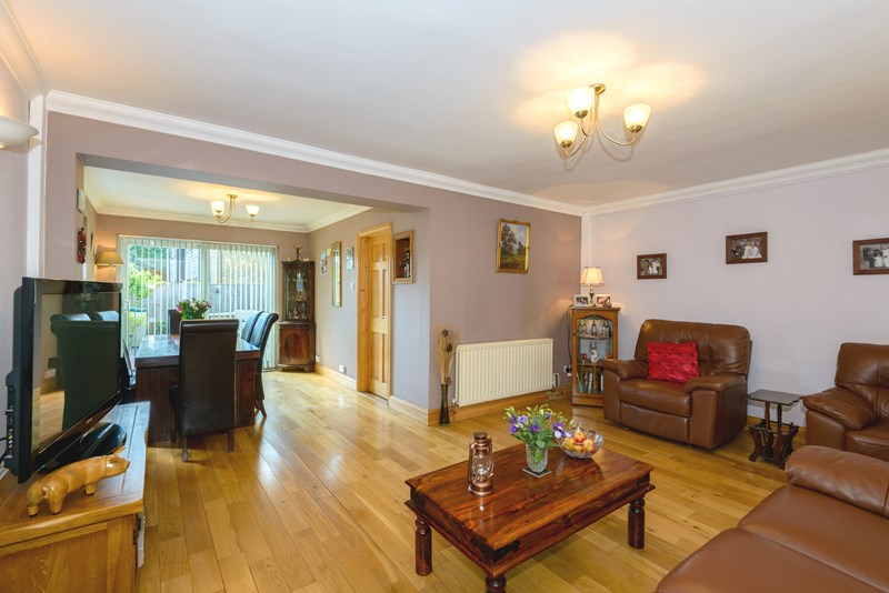 A dual aspect room with uPVC double glazed patio doors leading onto the south facing rear garden and uPVC double glazed window to side. Oak flooring. Pine lipped skirting and architraves. Access to large understairs storage cupboard. Double banked radiator, further radiator. Television aerial point. Two wall light points, full width central flat headed archway. Coved cornice to smooth plastered ceiling. A six-panel pitch pine door leads through to the: