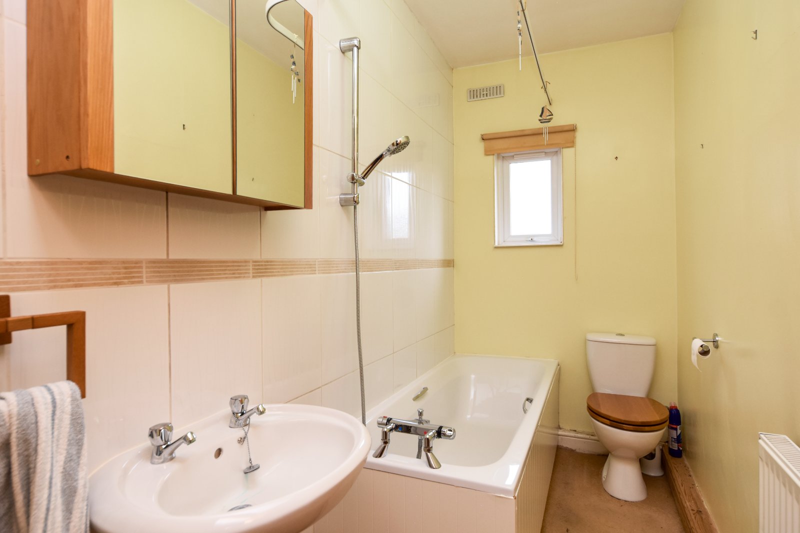 Obscure uPVC double-glazed window to rear aspect. The white three-piece suite featuring a panelled bath with twin handgrips, mixer tap and shower attachment over, pedestal wash hand basin with twin taps, and low-level dual flush WC. Part-tiled walls to splashback areas. Wall-mounted mirrored storage cabinet. Radiator. Smooth plastered ceiling.