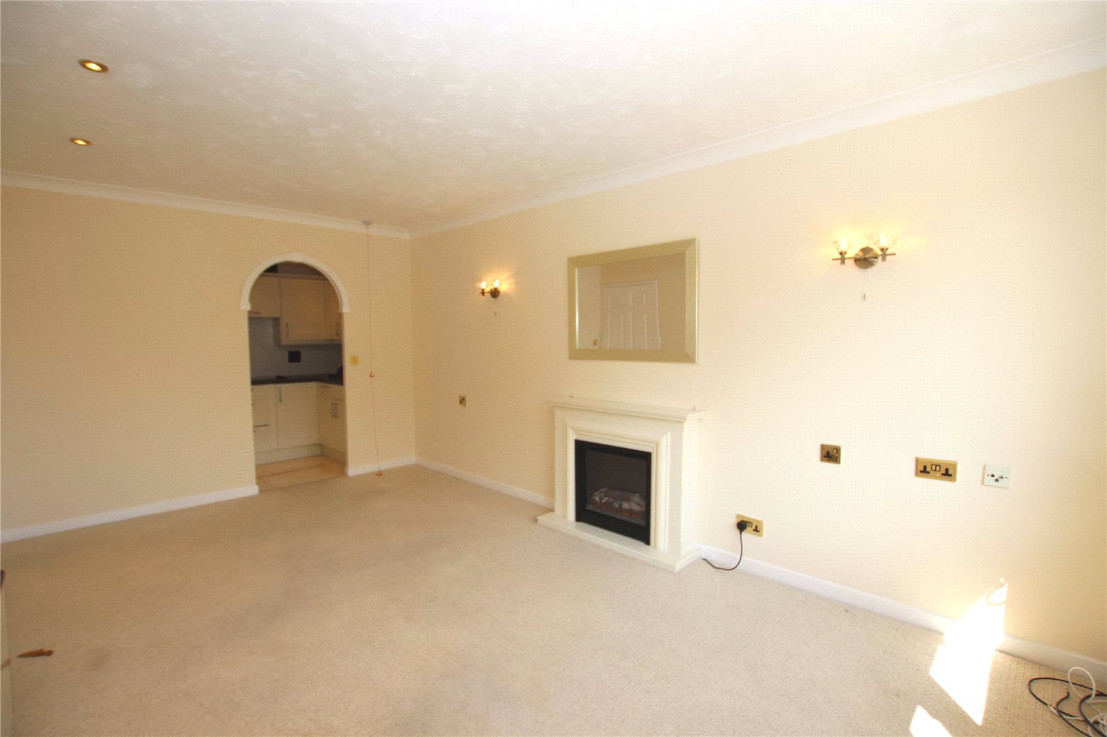 A bright well proportioned south facing room with double glazed window to front. Attractive feature fireplace with log effect electric fire. Storage heater. Coved ceiling with recessed lighting. Two wall light points. Archway leading to: