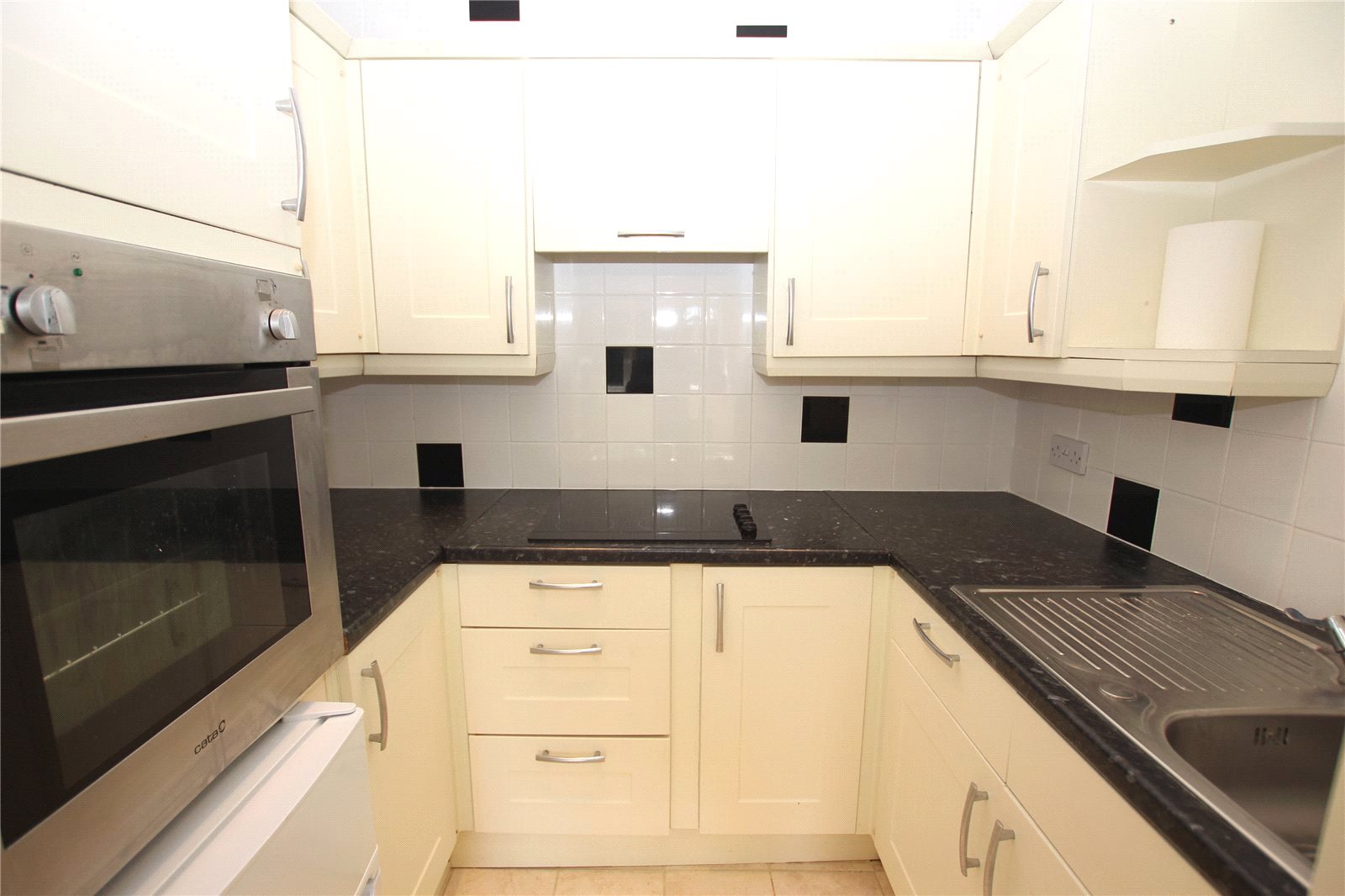 Fitted with a modern range of cream 'Shaker' style fronted units comprising rolled edge work surface with inset stainless steel sink unit with mixer tap. Range of cupboards and drawers below. Inset four ring ceramic hob with concealed extractor above. Saucepan drawers below. Oven housing with built in stainless steel oven. Cupboard above and space below for refrigerator. Matching wall mounted storage cabinets. Coved ceiling with recessed lighting. Tiled walls. Tiled floor.