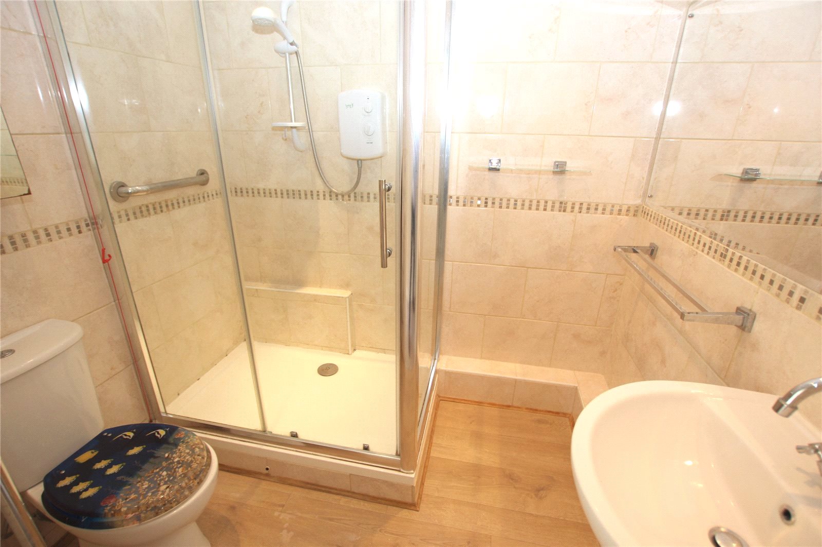 Fitted with a modern white suite comprising fully tiled double corner shower cubicle. Pedestal wash basin with mixer tap. Pop up waste. Low flush WC. Attractive tiled walls. Wood effect flooring. Chrome heated electric towel rail. Electric wall heater. Coved ceiling with recessed lighting. Large mirror. Shaver point.