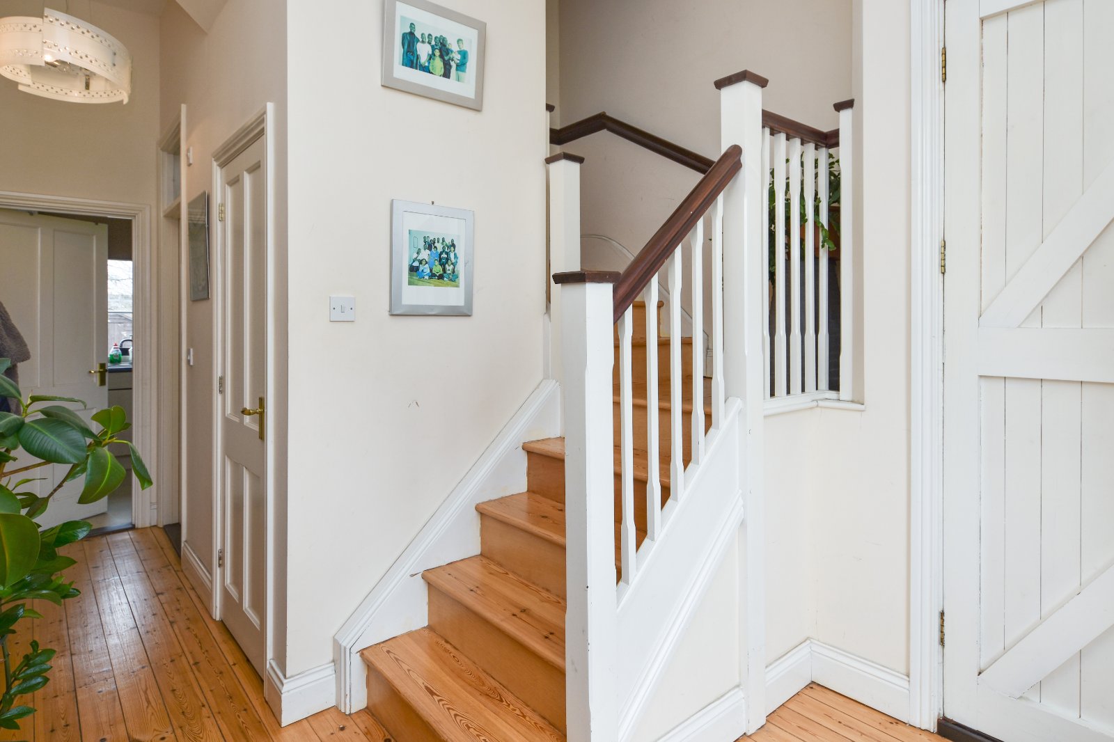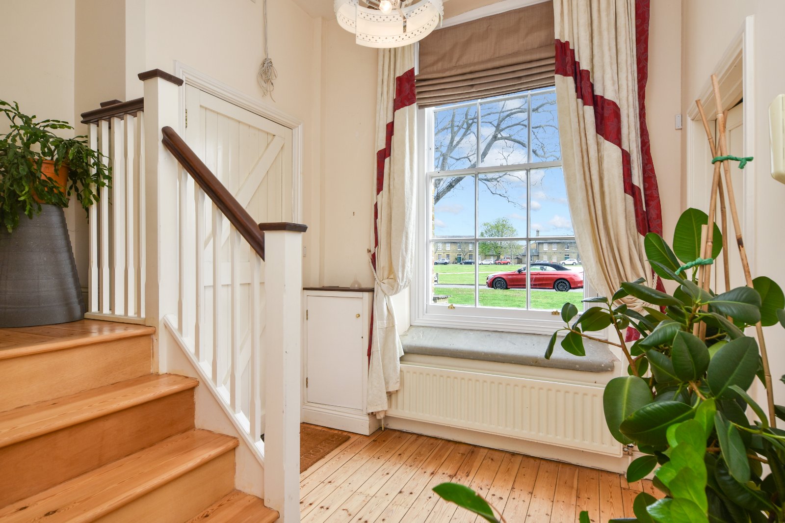 Impressive portrait sash cord Georgian style window overlooking 'The Horseshoe'. Attractive turned staircase rising to the First Floor Accommodation with spindle balustrade. Two radiators. Stripped wood flooring. Panelled door to under stairs storage cupboard housing the hot water tank. Further low level cupboard housing meters. Thermostat control panel. Security Entryphone handset. Access to all ground floor rooms. Smooth plastered ceiling (ceiling height 11ft).