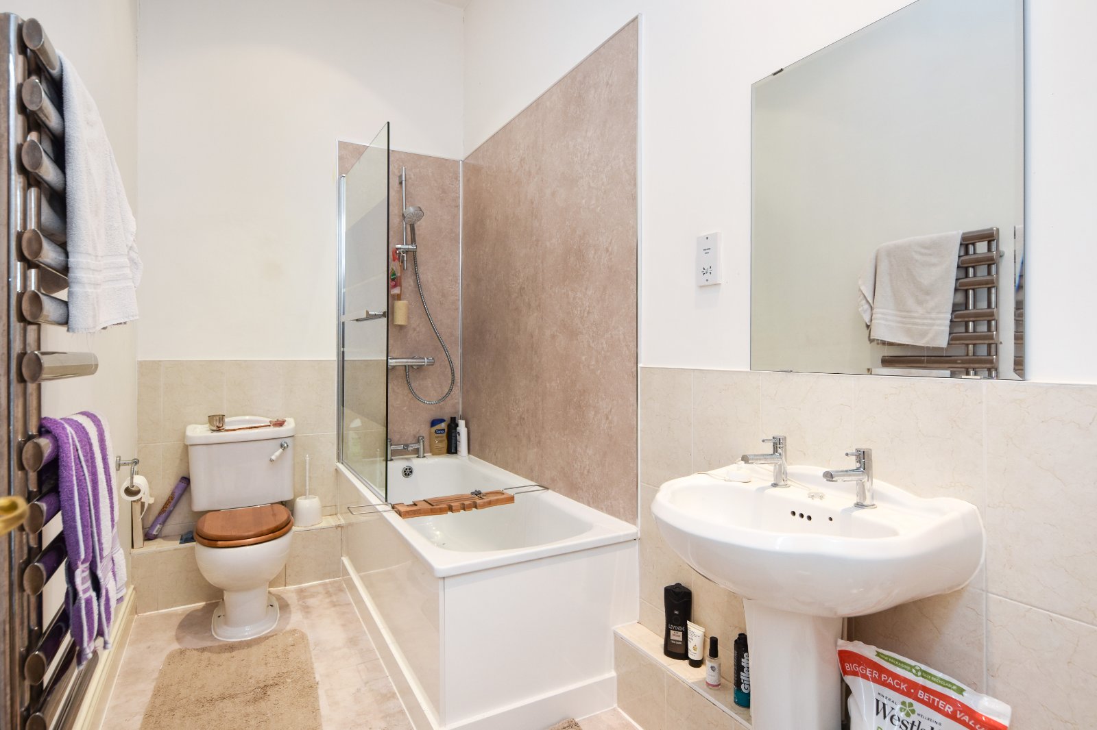 The white three piece suite comprises panelled enclosed bath with mixer tap over and integrated shower unit over with fitted shower screen, pedestal vanity wash hand basin with mixer tap over and low level flush WC. Partly tiled walls with shower boarding to the bath area. Ladder style heated towel rail. Shaver point. Smooth plastered ceiling inset with recessed lighting and extractor fan.