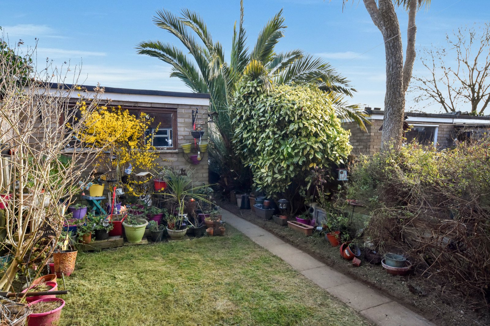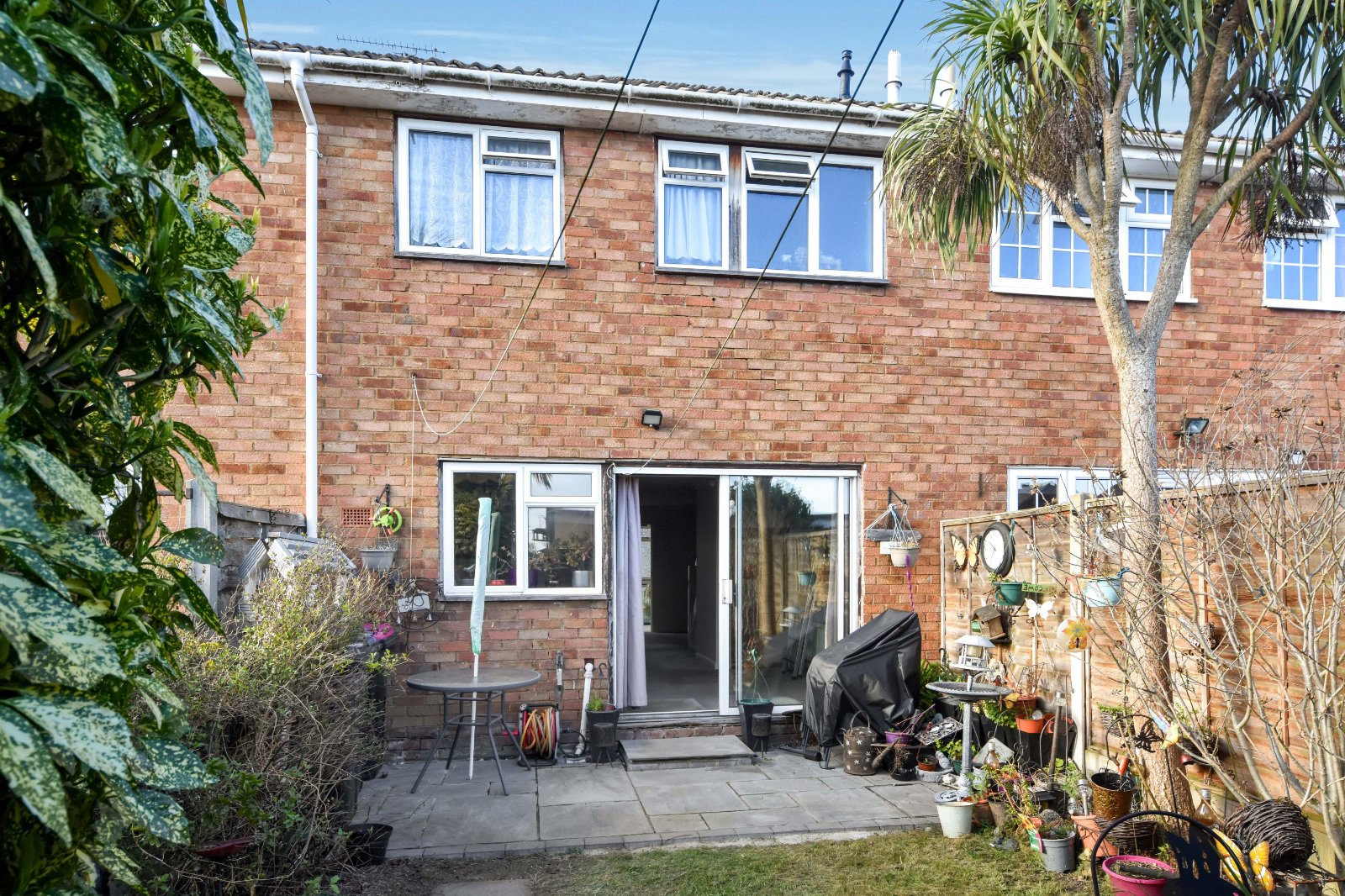 The SOUTH FACING rear garden is accessed via the Dining area and begins with a patio seating space, ideal for outdoor entertaining. This leads onto a modest lawn, bordered by a variety of established shrubs and mature planting. The garden also benefits from gated rear access, along with an external water tap and outdoor lighting.