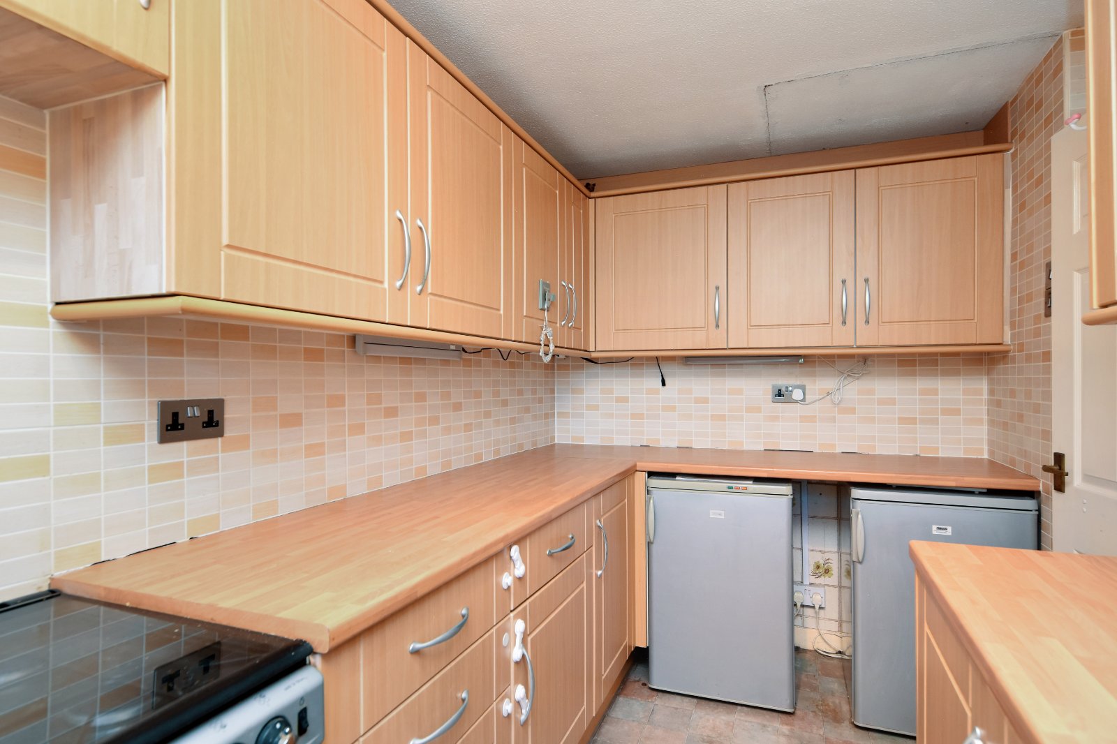 Double glazed window to rear aspect. The Kitchen is fitted with a range of eye and base level units with wood effect rolled edge working surfaces over inset with single drainer sink unit with mixer tap over. Freestanding 'Newhome' double oven with four ring gas hob over. Undercounter 'Zanussi' fridge and freezer (to remain). Undercounter 'Zanussi' washing machine (to remain). Splashback tiling. Tiled effect flooring. Textured ceiling.