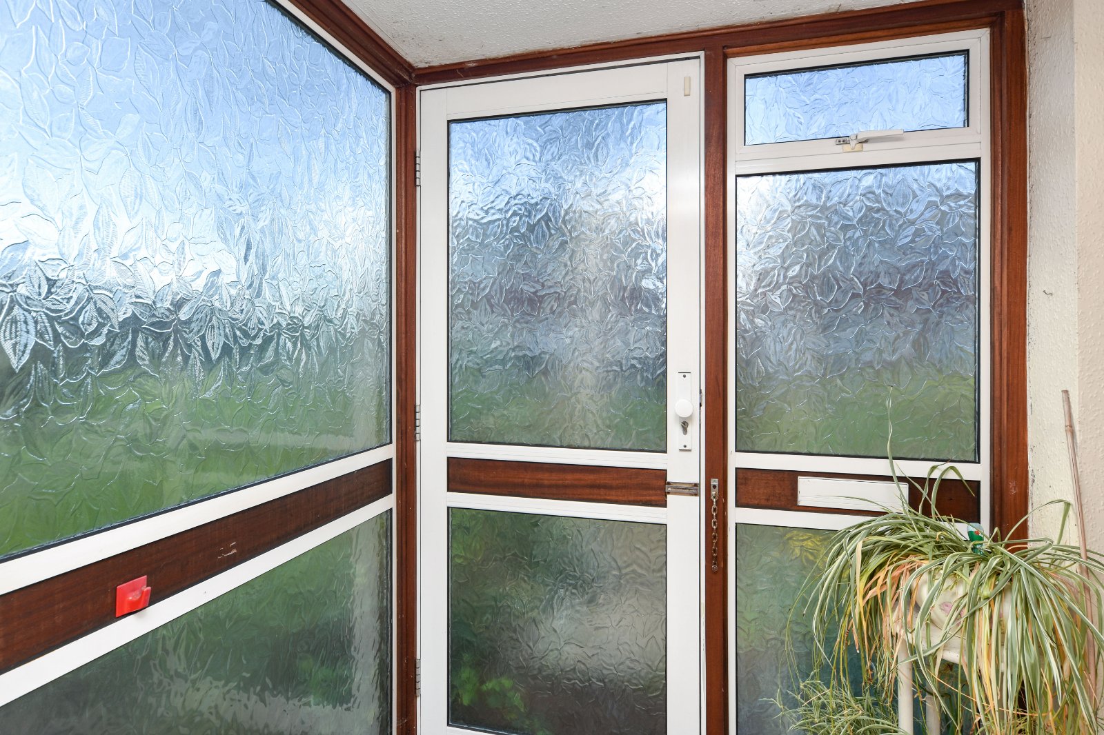 Obscure double glazed windows to front and side aspects. Cupboard housing utility meters. Textured ceiling. Multi pane glazed door to;