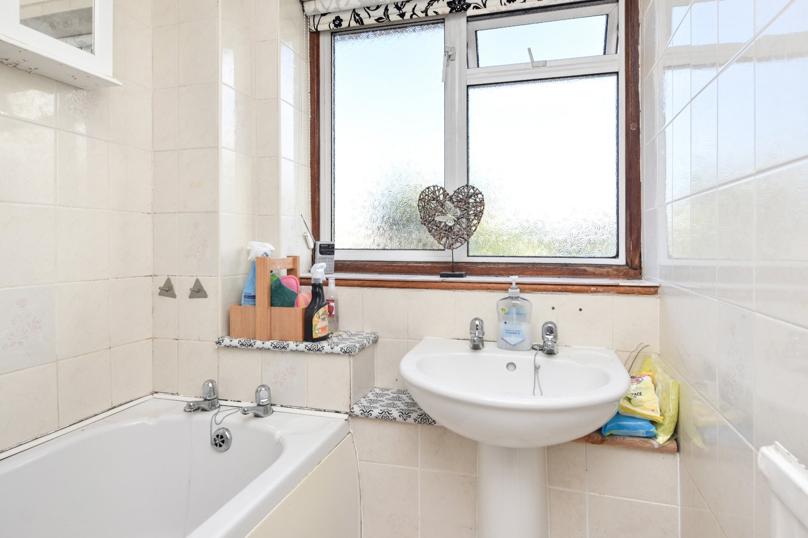 Obscure double glazed window to rear aspect. The two piece suite comprises panelled enclosed bath with wall mounted 'Galaxy' shower over and pedestal wash hand basin. Tiling to all visible walls. Radiator. Textured ceiling.