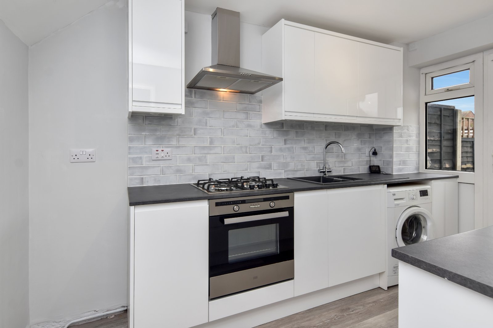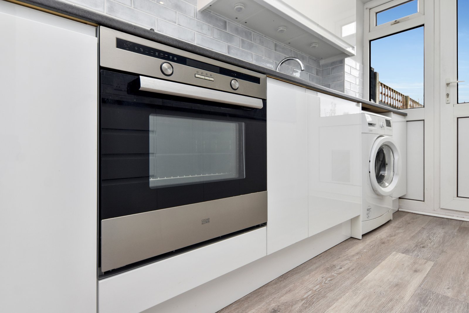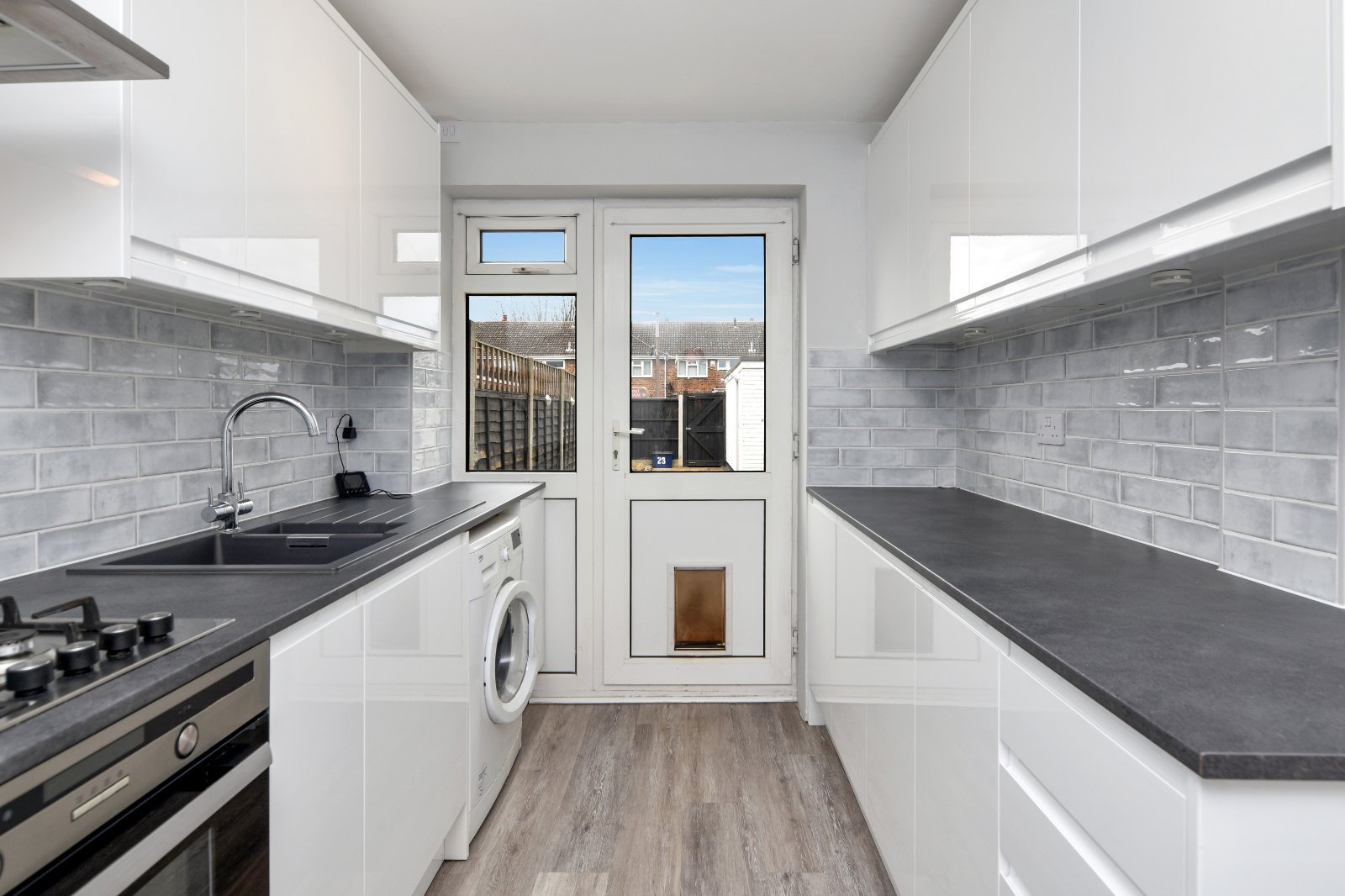 Double glazed door to rear with adjacent window providing good natural light. The recently upgraded Kitchen is fitted with a range of modern high gloss base and eye level units with rolled edge work surfaces incorporating a composite one and a half bowl sink and drainer unit with mixer tap. Integrated 'Cooke & Lewis' double oven with four ring gas hob over and wall mounted stainless steel extractor canopy over. Tiled splashbacks and under unit lighting. Under counter 'Beko' washing machine (included). Karndean flooring. Smooth plastered ceiling.