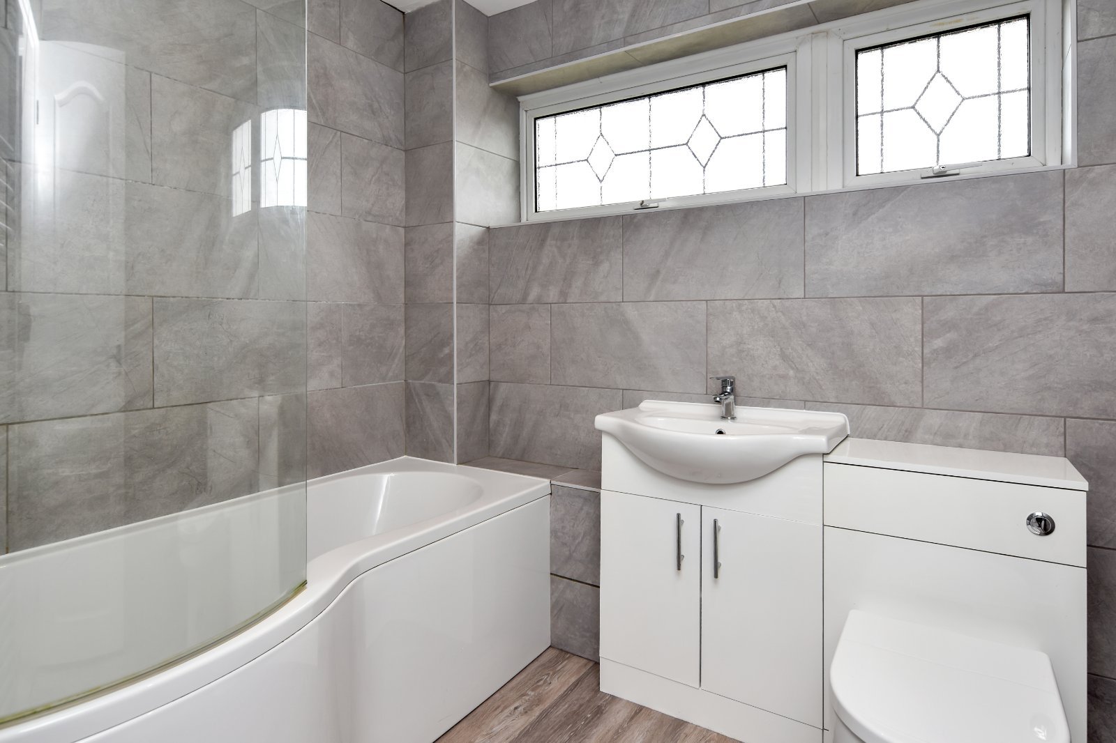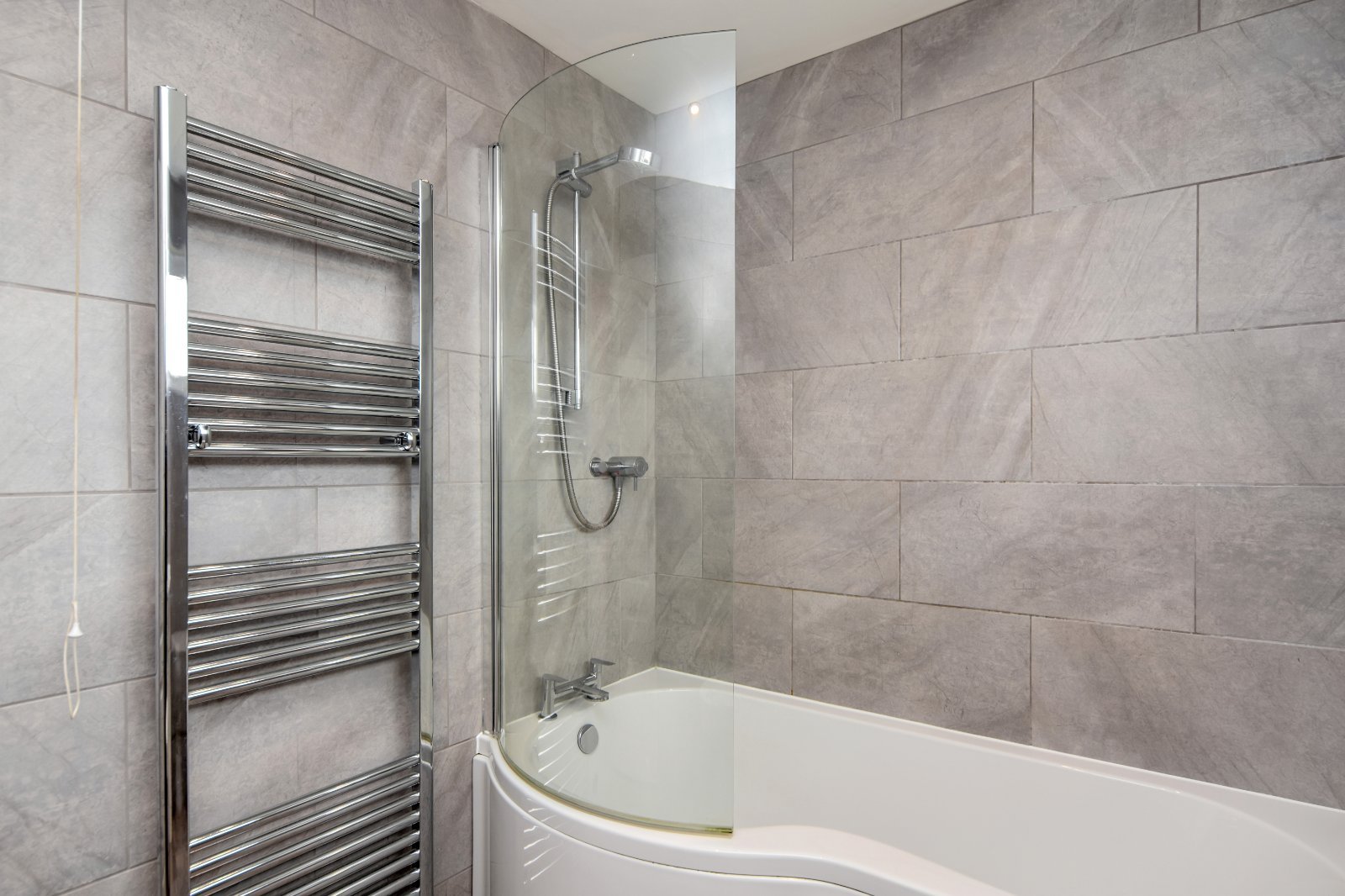 Obscure double glazed leaded window to rear. Refitted with a modern white suite comprising a panelled bath with wall mounted rainfall-style shower and additional handheld attachment, with curved glass shower screen, vanity wash hand basin with mixer tap and storage below, and low level WC. Contemporary tiled walls. Chrome heated towel rail. Smooth plastered ceiling with inset lighting.