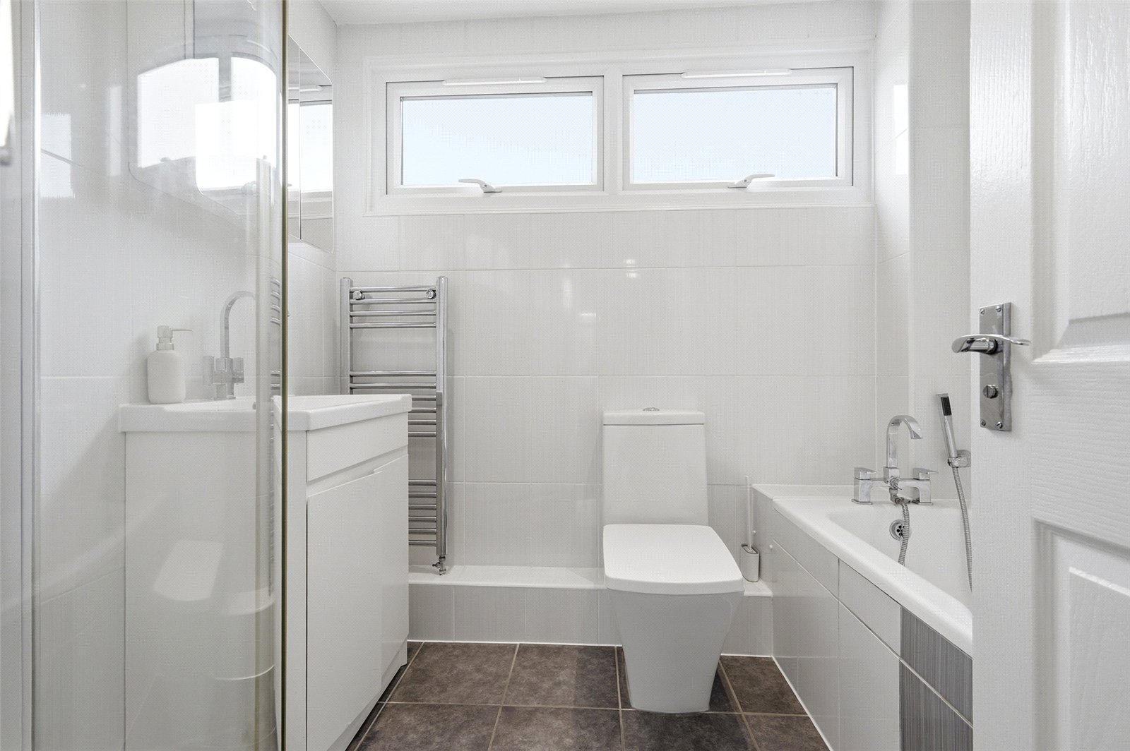 UPVC double obscured glazed window to rear. Fitted with a modern four piece suite comprising low flush WC, wash basin with mixer tap and storage cupboard beneath. Panelled bath with mixer tap, plus detachable showerhead and enclosed shower cubicle with wall mounted mixer, adjustable showerhead and glass shower screen. Chrome heated towel rail. Tiled floors. Fully tiled walls. Wall mounted medicine cabinet incorporating a vanity mirror. Smooth plastered ceiling with recessed LED lighting.