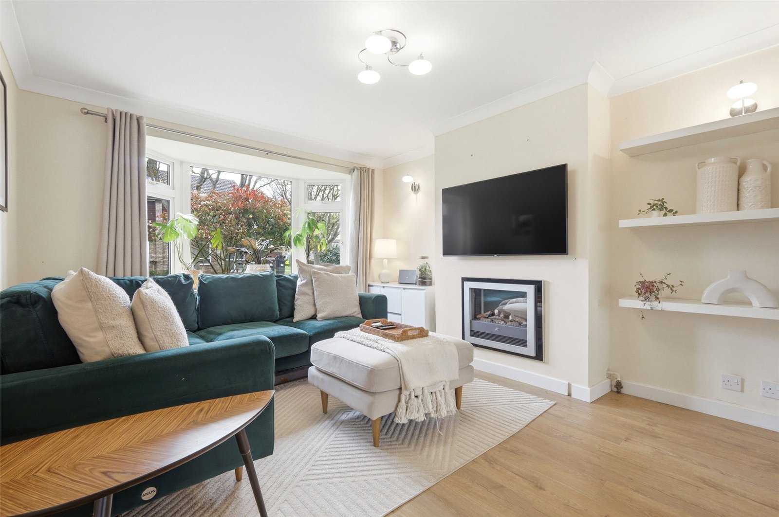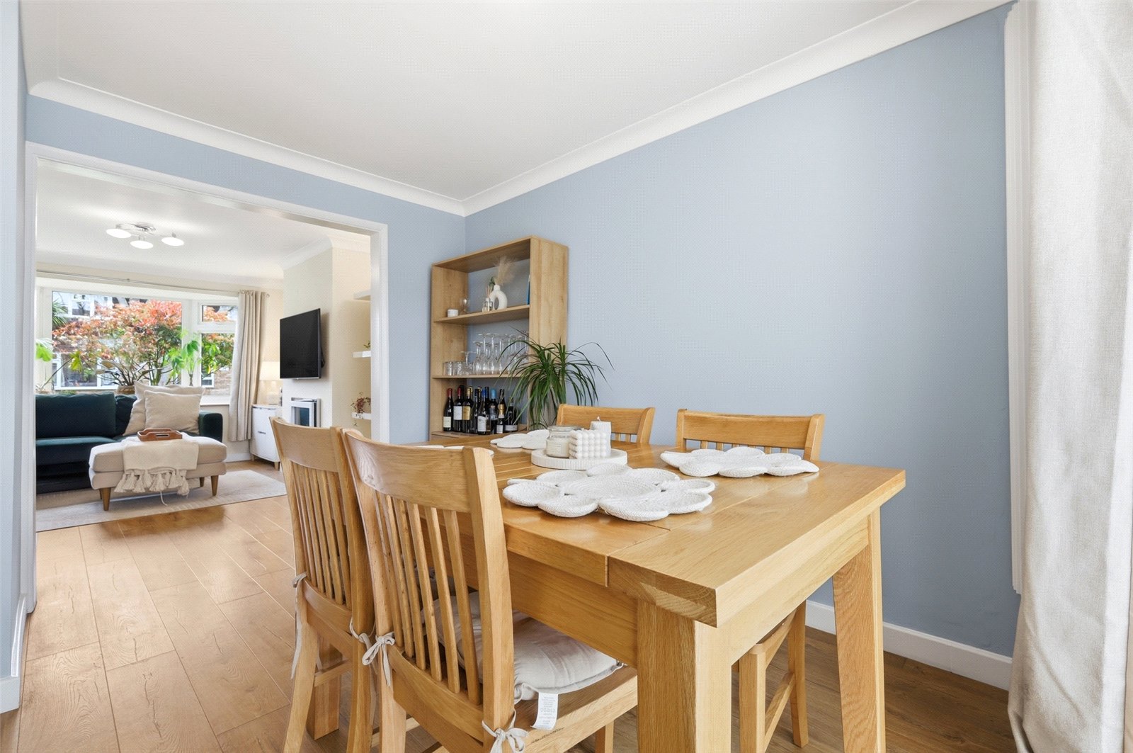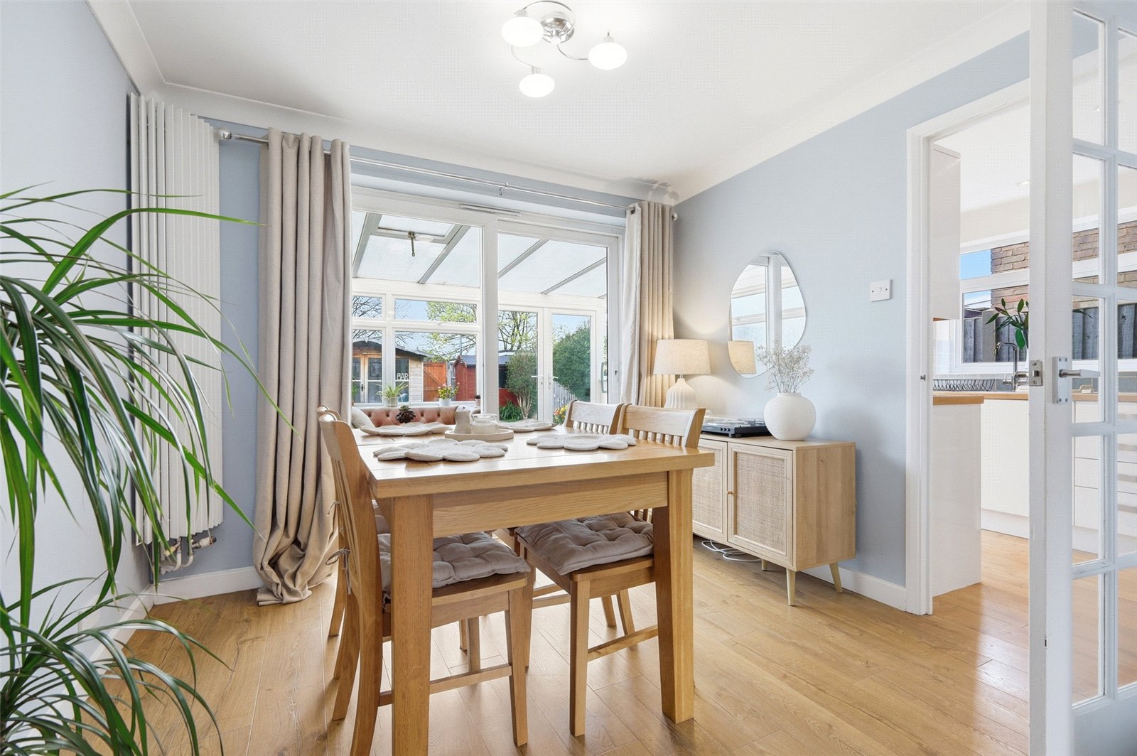 UPVC double sliding patio doors to rear leading on to conservatory. Wooden door to side with inset glazed panels provides access to kitchen. Wall mounted designer radiator. Wood effect laminate flooring. High level skirting. Coved cornice to smooth plastered ceiling.