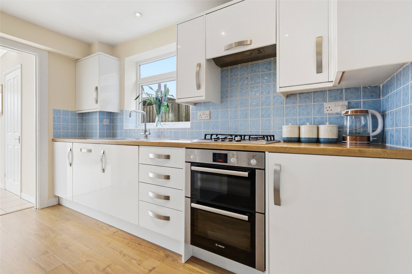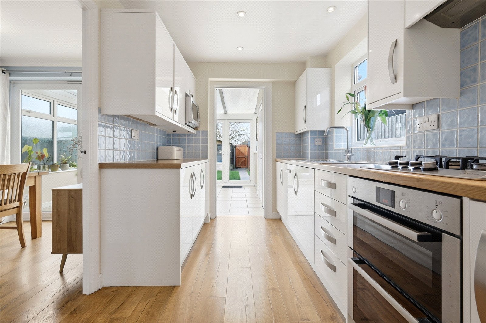 UPVC double glazed window to side. Wooden door with inset glazed panels to rear provides access to conservatory. Kitchen is fitted with a modern range of high gloss base and eye level cabinets incorporating a rolled edge working surface, inset one and half bowl stainless steel sink with mixer tap and drainer unit. Fitted incinerator. Food waste disposal. Inset four burner gas hob with integrated extractor hood above. Integrated double oven. Integrated dishwasher and fridge/freezer. Recess for microwave oven. Tiled splashbacks. Wood effect laminate flooring. High level skirting. Smooth plastered ceiling with recessed LED lighting.
