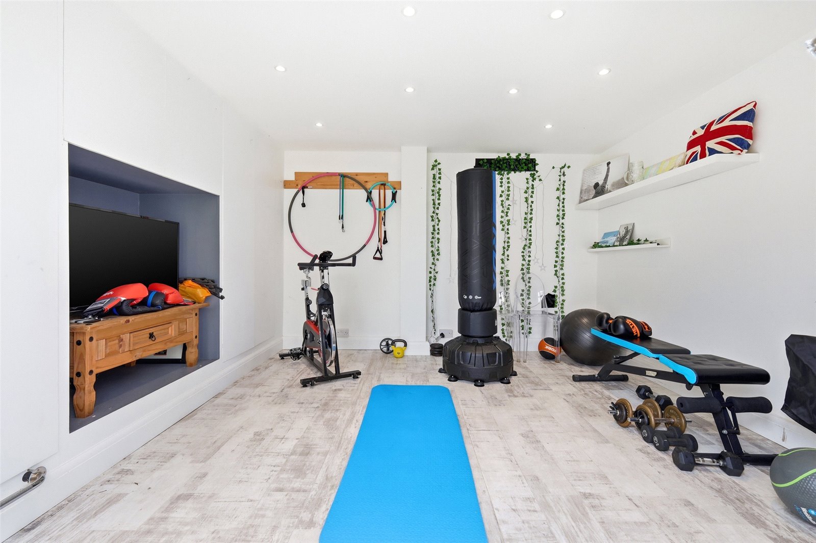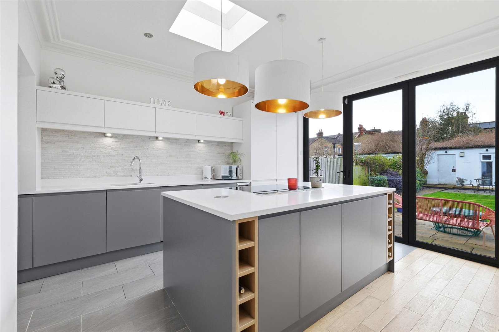 Large almost full width double glazed bi folding doors to rear leading to the sunny West backing rear garden. Kitchen is fitted with a modern and contemporary range of base and eye level handleless cabinets incorporating a quartz working surface. Large central island unit with matching working surface. Inset five burner Siemens induction hob with retractable extractor hood. Dual Siemens electric fan assist oven. Integrated dishwasher. Integrated full height fridge and freezer. Fitted wine cooler. Undermount one and half bowl stainless steel Frank sink with mixer tap and grooved drainer unit. Stone splashback to kitchen area. Two roof lanterns. Wall mounted high level designer radiator. Fitted display shelving. Engineered Oak flooring to dining area. Tiled floor to kitchen. high level skirting. Coved cornice to smooth plastered ceiling with recessed LED lighting. Further drop pendant lighting to central island unit.
