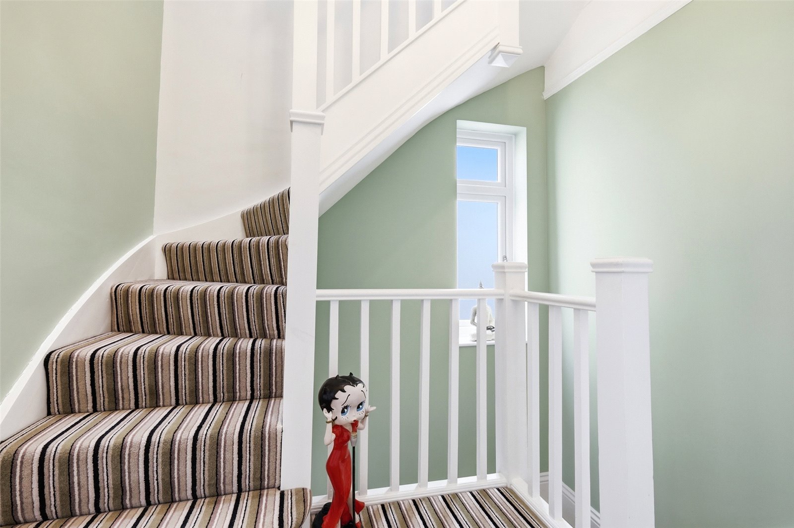 UPVC double obscured glazed window to side. Doors lead off to first floor rooms. Staircase rising to second floor accommodation. High level skirting. Feature picture rail. Coved cornice to smooth plastered ceiling with decorative ceiling rose.