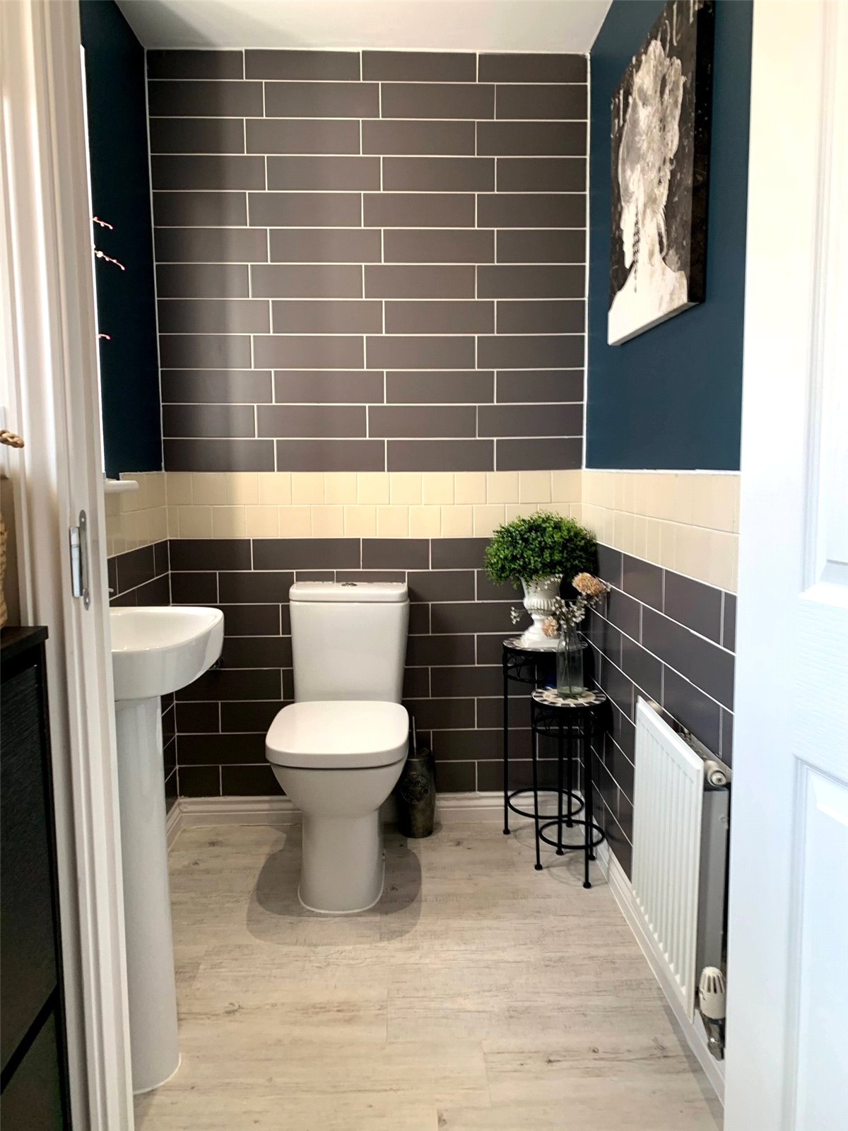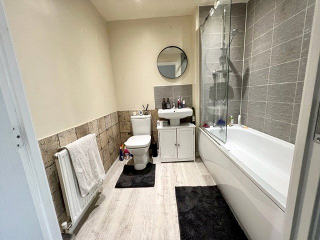 Obscure UPVC double glazed multi-pane window to front. Fitted with a two piece suite comprising dual-flush close coupled WC and pedestal wash hand basin. Ceramic tiling to half-height, with full wall feature tiles and inset border tiles. Grey oak effect laminate flooring. Radiator. Smooth plastered ceiling. Recessed LED lighting.