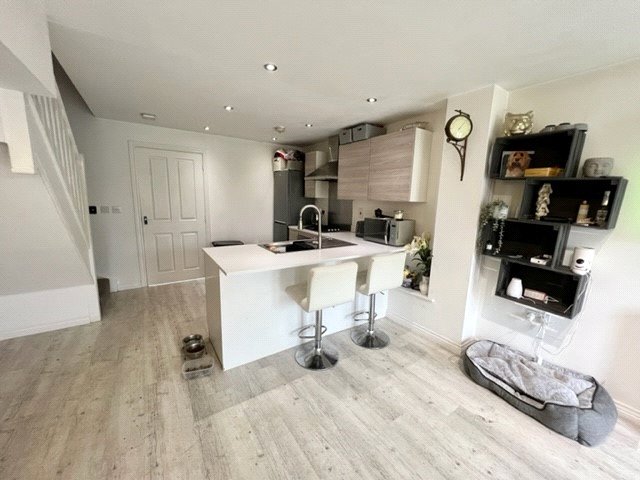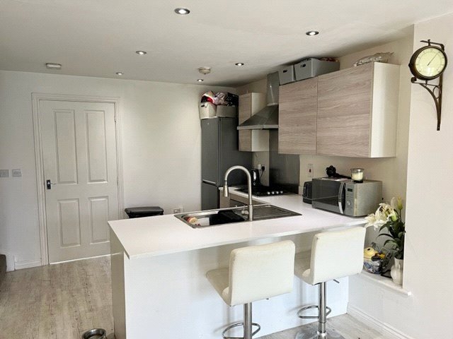 UPVC double glazed French doors give access to the landscaped rear garden. UPVC double glazed multi pane window to rear. Grey oak effect flooring. Radiator in ornamental cabinet. Lipped skirting. Television aerial point with recessed wiring for flatscreen wall mounted television. Smooth plastered ceiling. The kitchen area is fitted with a comprehensive range of base and eyelevel cabinets in contemporary grey oak effect units, with slimline white working surfaces and inset stainless steel sink unit with designer mixer tap. The range of integrated appliances includes Zanussi split level fan assisted electric oven in brushed steel with four ring gas hob, brushed steel splashback and contemporary extractor canopy above. Space for upright fridge/freezer. Integrated dishwasher and integrated kickspace heater. Lipped skirting. Smooth plastered ceiling with recessed LED lighting.