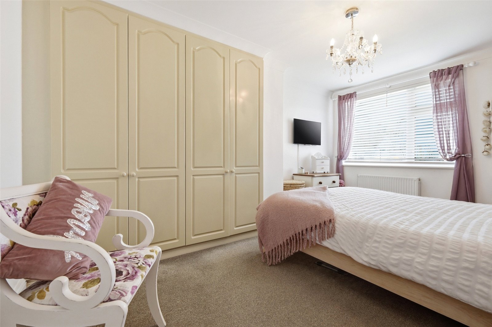 uPVC double glazed window to front. Radiator. Lipped skirting. Range of built in bedroom furniture comprising two double fronted full height wardrobe cupboards with hanging and shelved storage space. Coved cornice to smooth plastered ceiling.