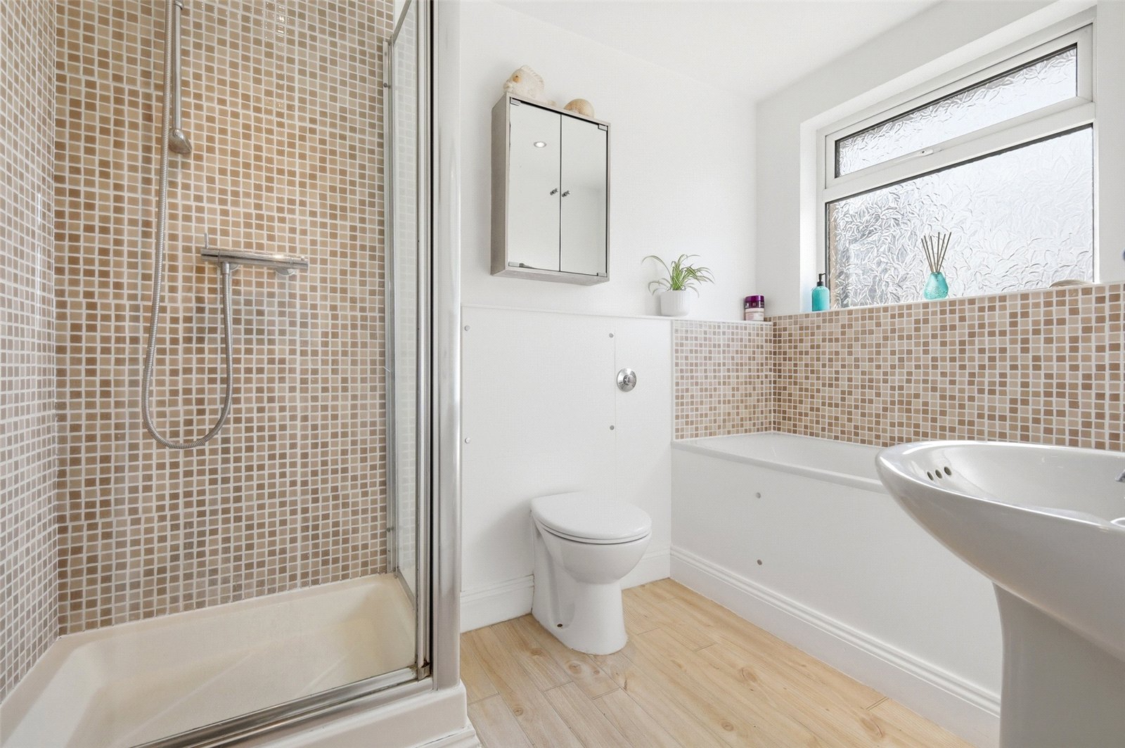 A four piece family bathroom with obscure uPVC double glazed window to rear. Fitted with a three piece suite comprising integrated cistern WC, pedal wash basin with mosaic effect tiled splashback, panel enclosed bath with chrome and brass telephone mixer tap with shower attachment and large shower enclosure with inset power shower. Full height heated towel rail. Oak effect flooring. Lipped skirting. Smooth plastered ceiling with recessed LED lighting.