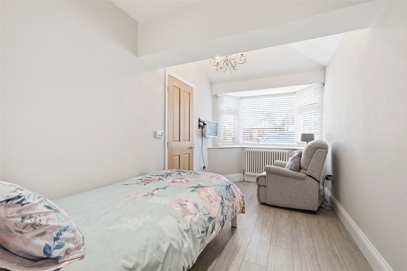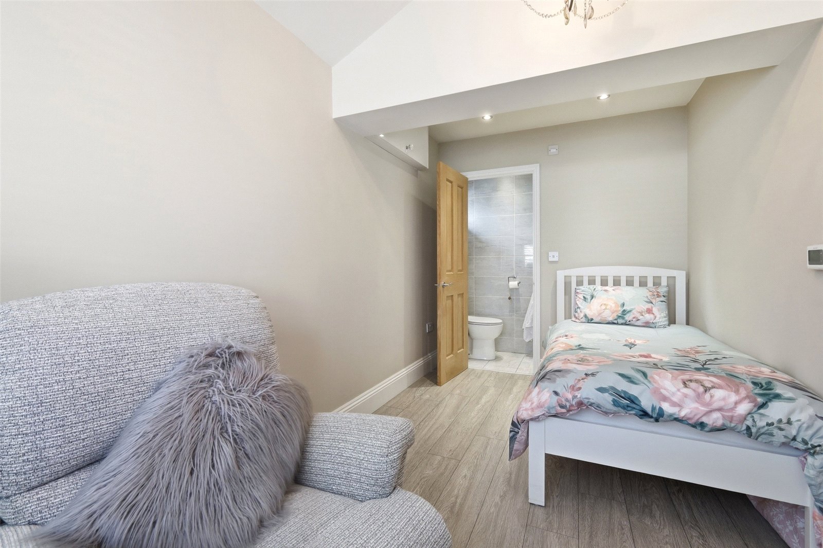 An impressive ground floor guest suite - suitable for use as an annexe bedroom, home office or additional reception space. uPVC double glazed bow window to front. Grey oak effect flooring. Lipped skirting. Old school style radiator. Feature vaulted ceiling with recessed LED lighting. A four panel oak door gives access to: