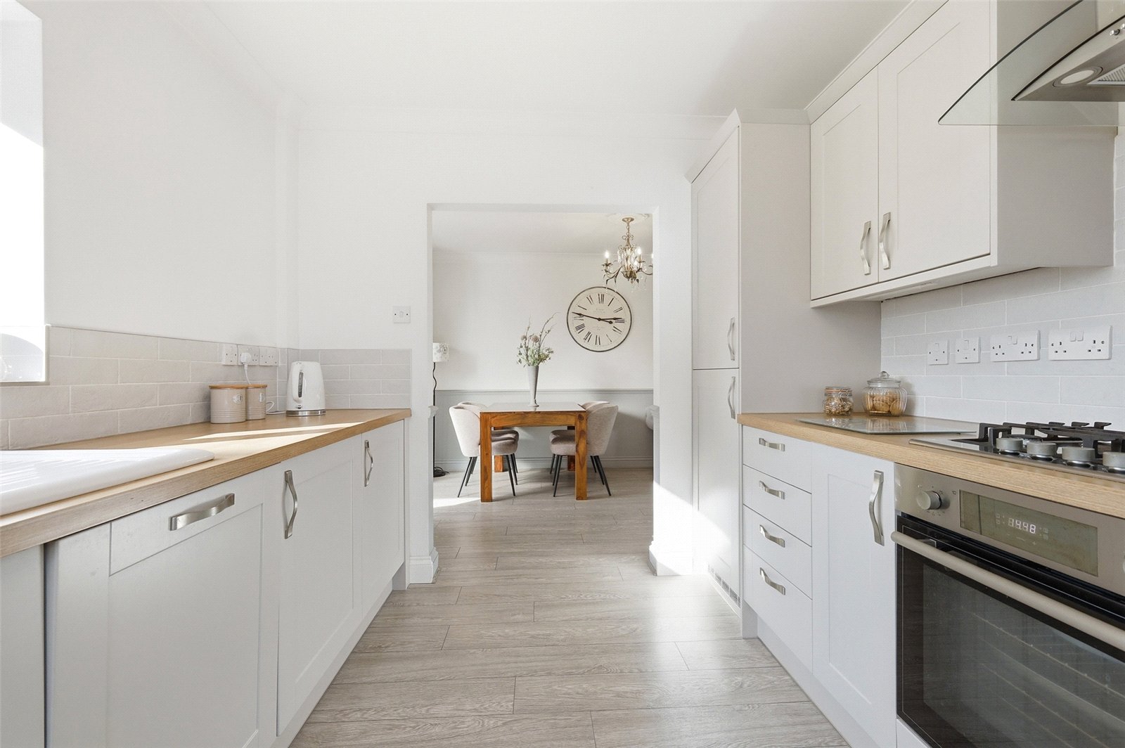 A recently re-fitted dual aspect room with obscure uPVC double glazed door to side, uPVC double glazed window to side and uPVC double glazed window overlooking the landscaped rear garden. Grey oak effect flooring. Lipped skirting. The kitchen has been fitted with a comprehensive range of base and pelmetted eye level cabinets in taupe grey Shaker style units. Oak effect working surfaces. Metro tiled splashbacks with aluminium bordered edging. The range of integrated appliances includes split level fan-assisted electric oven with four ring gas hob and designer extractor canopy above, fridge, freezer and dishwasher. Inset enamel sink unit with mixer tap. Coved cornice to smooth plastered ceiling.
