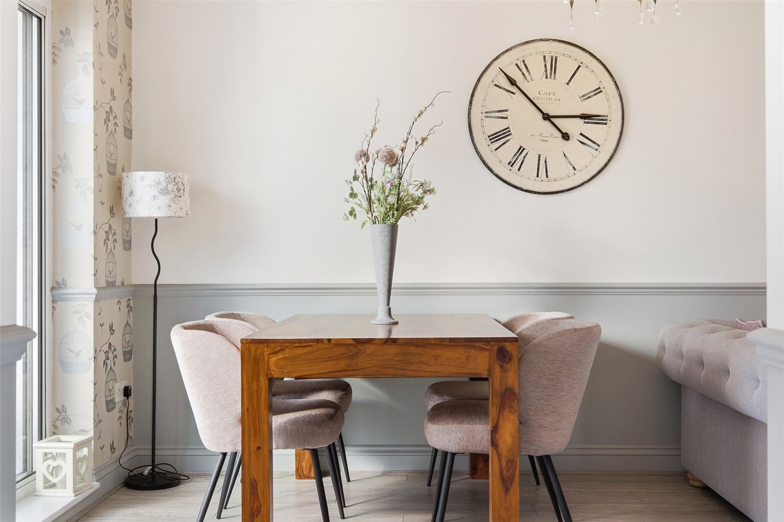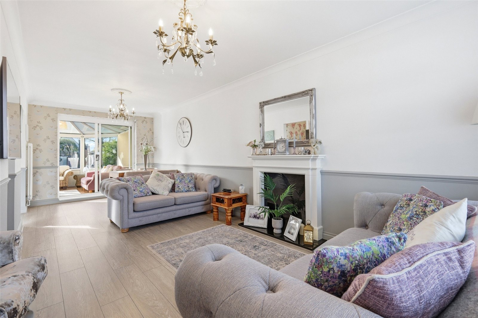 An impressive dual aspect room with double glazed patio doors giving access to the sun lounge and uPVC double glazed window to front. Feature fire surround with polished marbelite hearth and insert. Television aerial point. Grey oak effect flooring. Lipped skirting. Dado rail. Old school traditional and vertical radiators. Coved cornice to smooth plastered ceiling with twin ceiling roses. A flat headed opening leads through to an:space and recessed LED lighting. Coved cornice to smooth plastered ceiling.