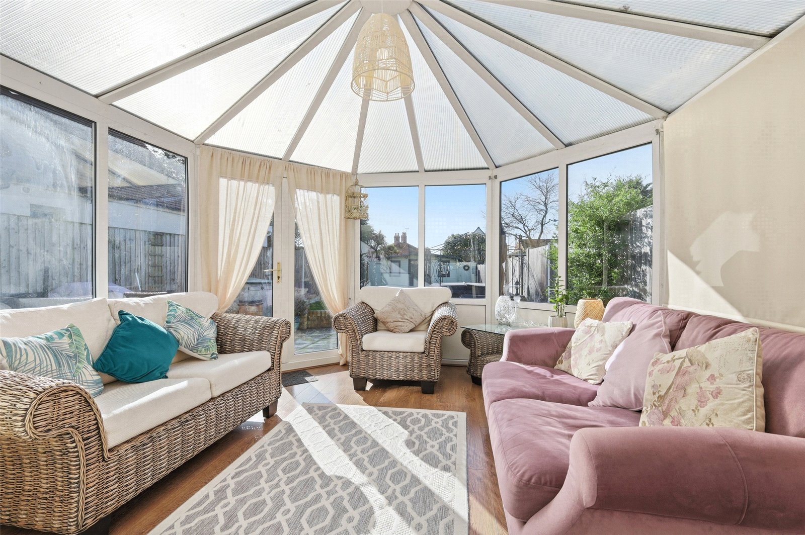 Oak effect flooring. Hexagonal design, with a pair of French doors giving access to the landscaped rear garden, and full height and half height double glazed windows overlooking the landscaped rear garden. Vaulted triplex Perspex reflectorlite roof. Two radiators. Power connected.