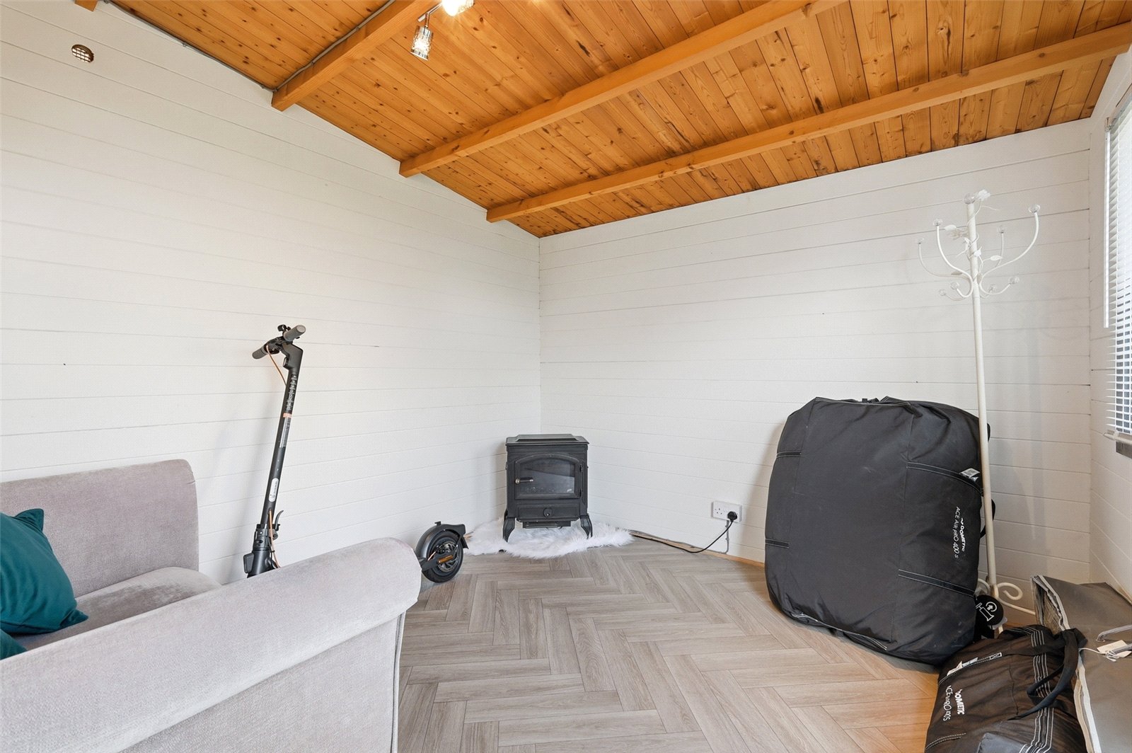 An impressive modern garden cabin with double glazed windows to front and a pair of double glazed French doors giving access. Herrinbone oak effect flooring, power and light connected. Attached storage rooms and additional storage area to the rear.