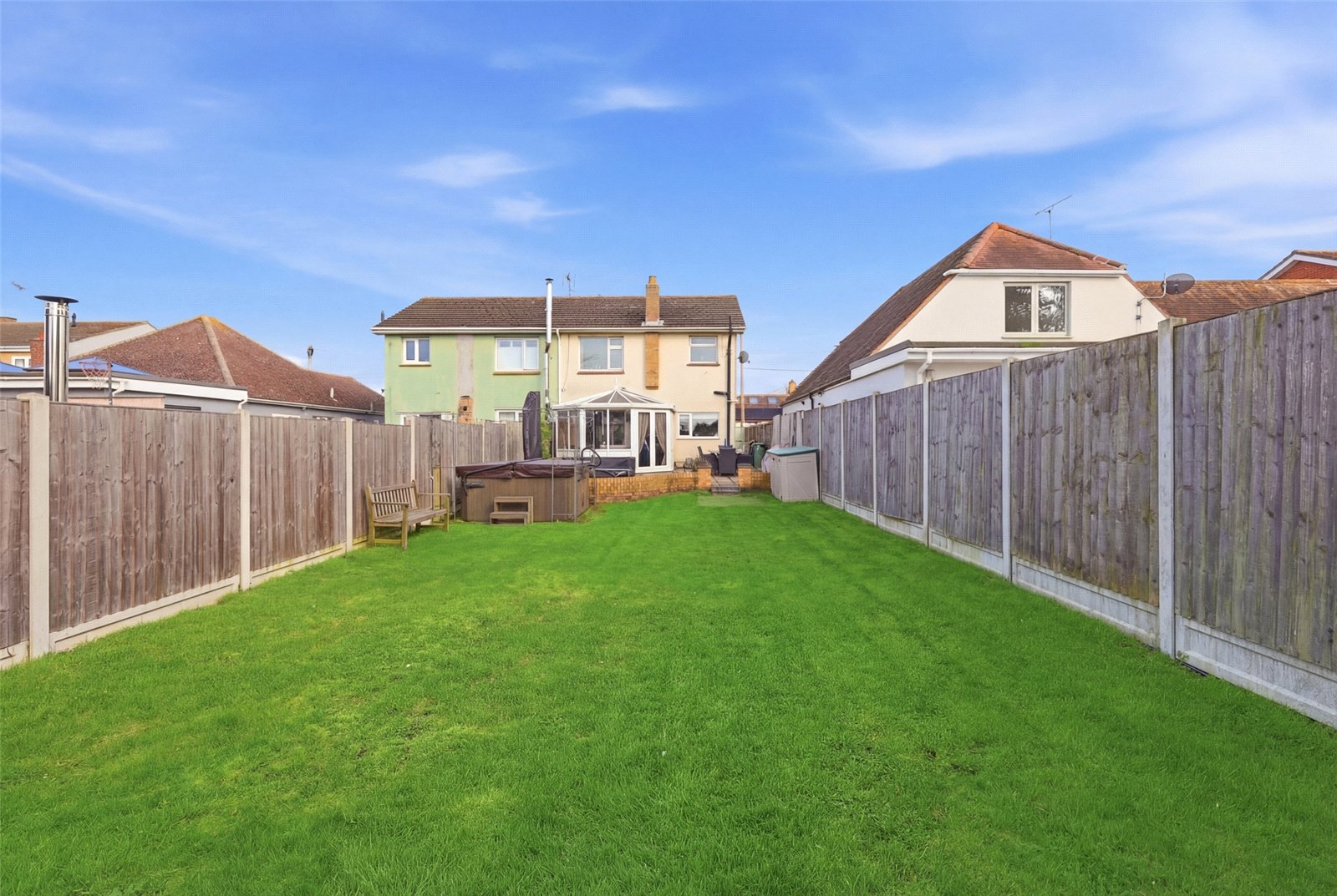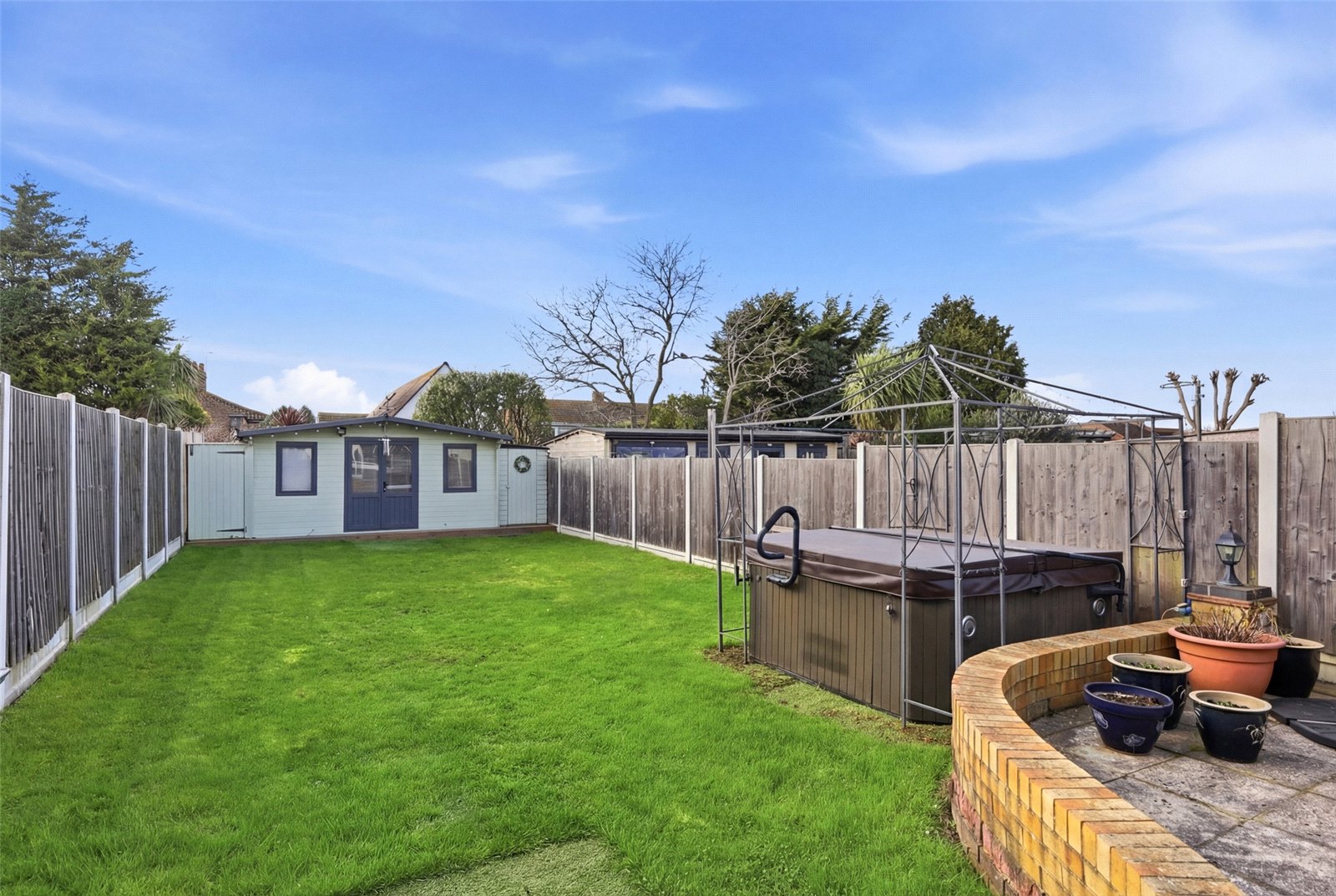 The west facing, well proportioned rear garden commences from the sun lounge with an extensive paved patio terrace with decorative retaining dwarf wall, ideal for dining alfresco. Secure gated side access to the front of the property. The garden is attractively laid to lawn with full height fencing to both sides, and hardstanding for a large modern detached garden lodge.