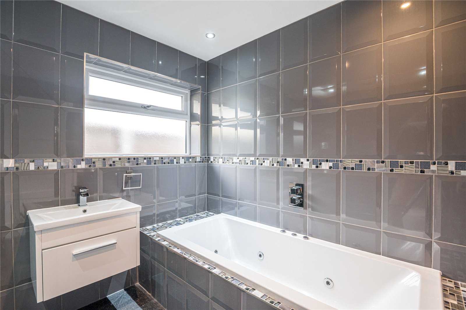 Obscure uPVC double glazed window to side. Fitted with a four piece suite comprising executive tiled panel enclosed spa bath with integrated mixer tap above, vanitory wash hand basin with gloss fronted cabinet and monobloc chrome mixer tap, frameless walk-in multi-jet shower enclosure with tiled recess, hand held shower, rainwater shower and body jets and close coupled w.c. Chrome heated towel rail. Granite effect anti-slip flooring. Gloss porcelain tiles to walls with inset glass and metallic feature mosaic border. Smooth plastered ceiling. Recessed LED lighting. Extractor fan.