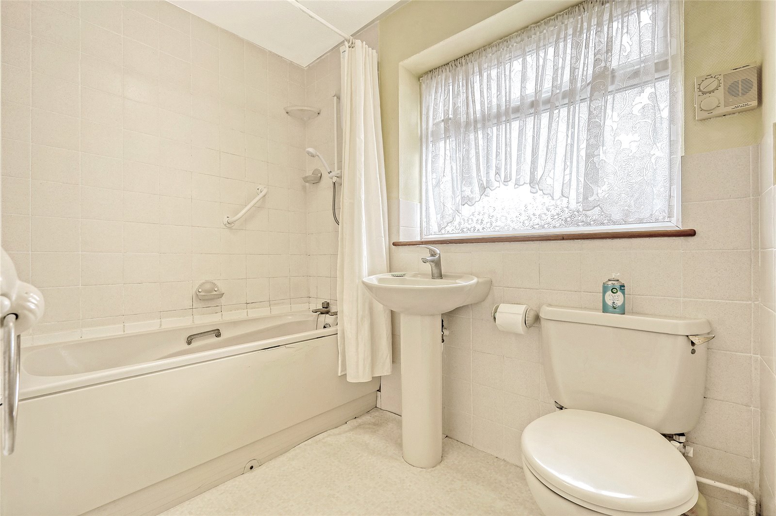 UPVC double obscured glazed window to side. Fitted with a three piece suite comprising low flush WC, wall mounted wash basin with mixer tap and panelled bath with separate overhead electric shower with adjustable showerhead. Wall mounted radiator. Tiled effect vinyl flooring. Part tiled walls.