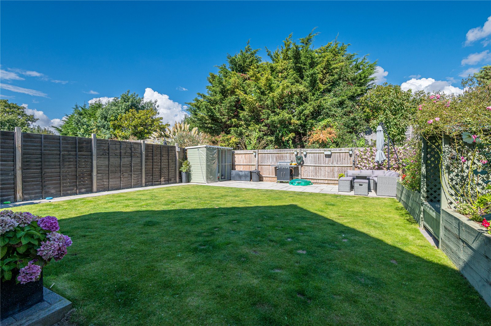 The landscaped rear garden commences with an '' Indian Sandstone '' patio area with pathway to the side leading to a further patio area situated to the rear of the plot. The remainder of the garden is mainly laid to lawn with a selection of flower and shrubs in a raised sleeper border. Fenced boundaries. Side access gate. External power points and water tap. Security light.