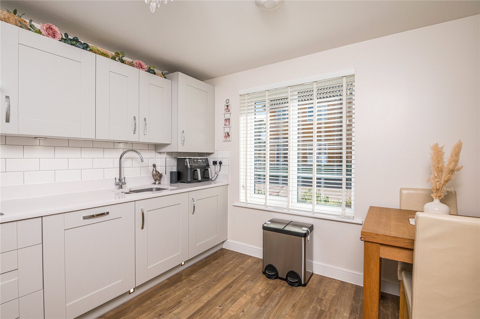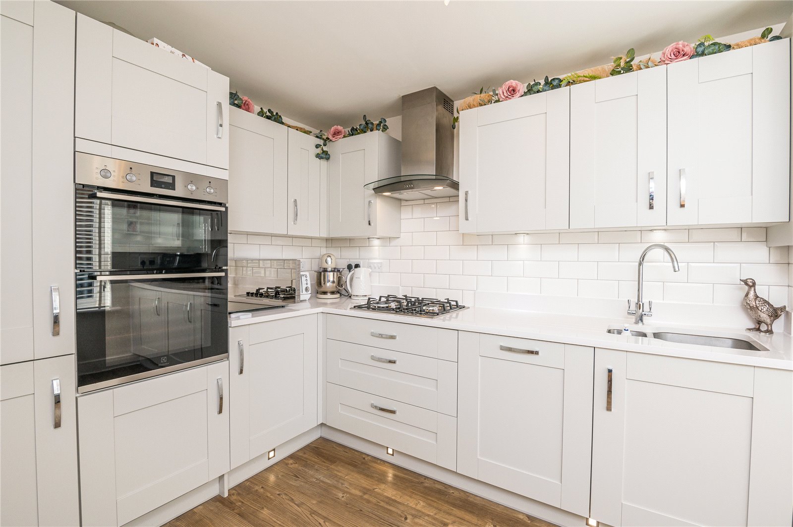 Upvc double glazed window to the front aspect. The kitchen is modern and fitted with a range of base units with '' Quartz '' work surface incorporating a one and a half bowl sink with built-in drainer. Integrated four ring gas hob with extractor fan over and double oven. Further matching wall mounted storage units housing central heating boiler with pelmet lighting under. Integrated washing machine, dishwasher and fridge/freezer. '' Quartz '' upstand. Part tiling to walls. Smooth plastered walls and ceiling. ''Amtico '' wood effect flooring. Radiator.
