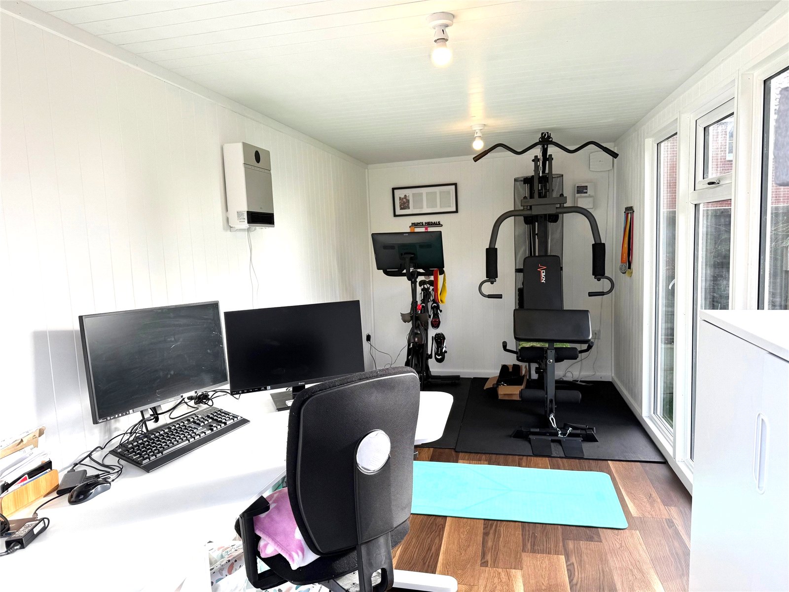 A pair of uPVC double glazed French doors give access to the professionally installed detached , insulated home office/leisure cabin, suitable for a variety of uses. Three panel, full height uPVC double glazed picture windows to front, timber effect flooring