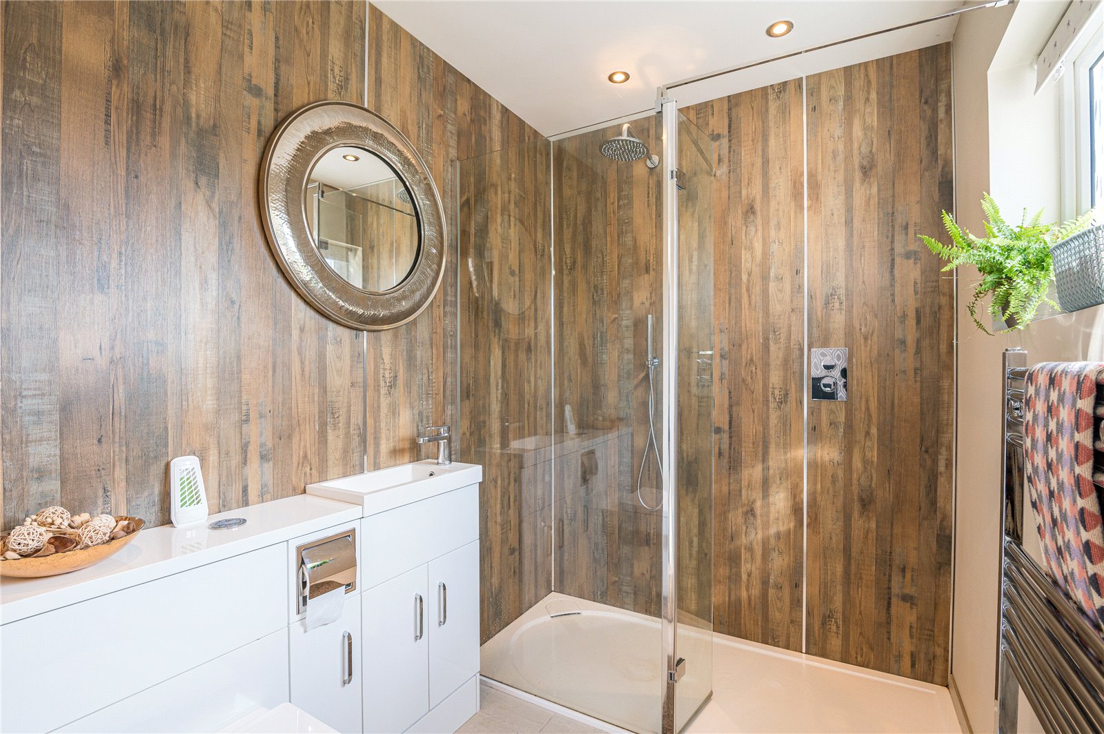 UPVC obscure double glazed window to front. Fitted with a modern and contemporary three piece suite comprising concealed flush W.C. Counter top mounted wash hand basin with mixer tap and storage cupboard beneath. Larger than average walk in shower with wall mounted mixer, rainfall shower head plus detachable shower head. Glass shower screen. Chrome heated towel rail. Fully tiled floors. Wood effect panelled walls. Smooth plastered ceiling with recessed LED lighting.