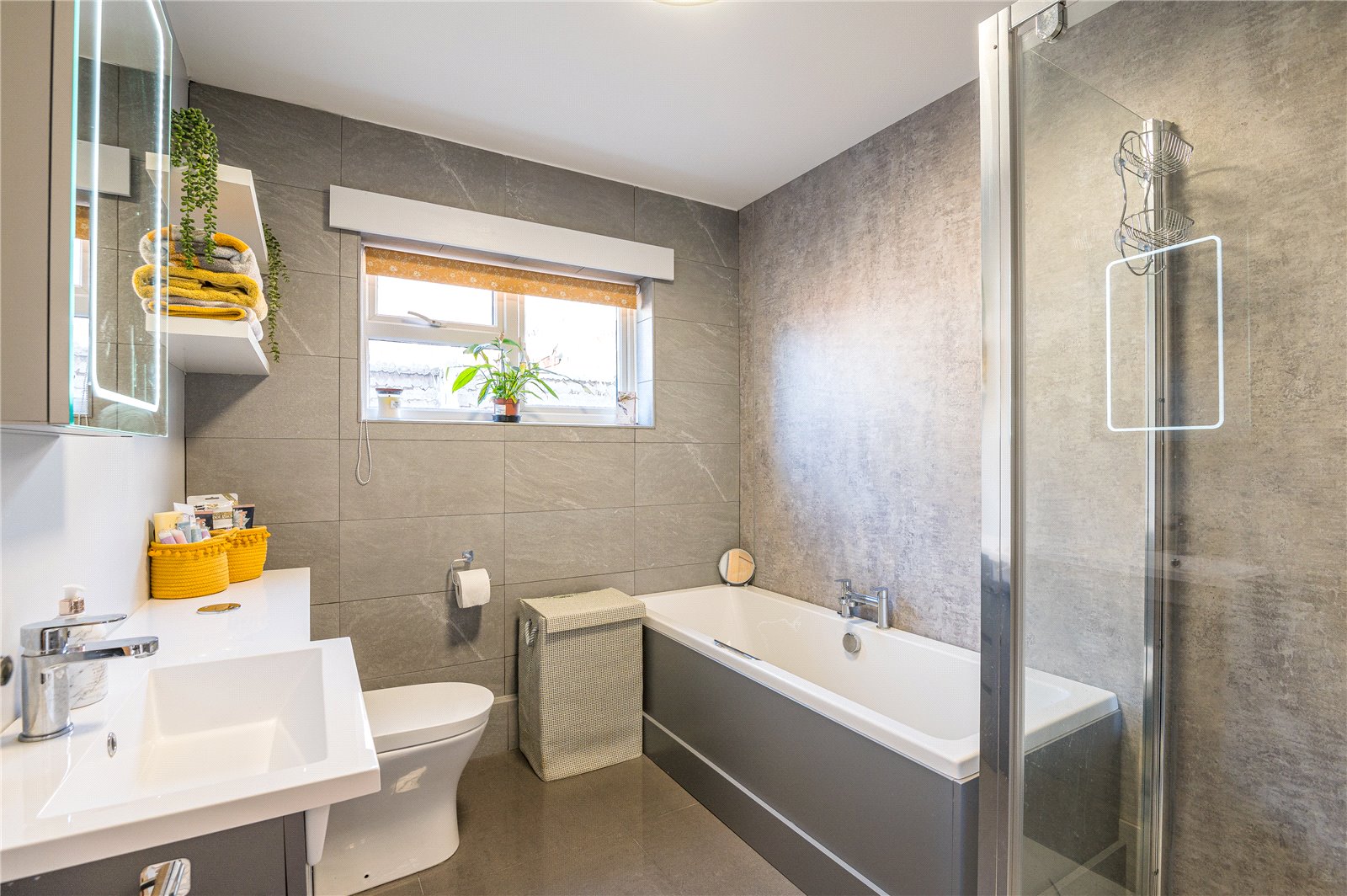 Upvc obscure double glazed window to side. Bathroom consists of a modern and contemporary four piece suite comprising of concealed flush W.C. Counter top mounted wash hand basin with mixer tap and storage cupboards and drawers beneath. Panelled bath with mixer tap. Enclosed shower cubicle with wall mounted mixer, rainfall shower head plus detachable shower head. Glass shower screen. Contemporary chrome heated towel rail. Fully tiled floors. Part tiled walls. Smooth plastered ceilings. Large fitted medicine cabinet with mirrored door and integrated LED lighting.