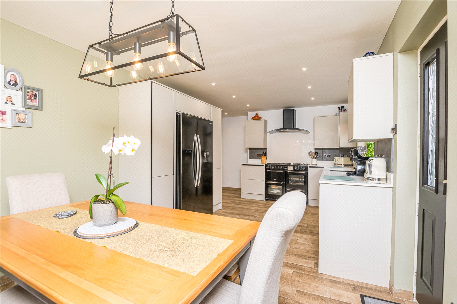 maximum size. Large open plan L shaped room. Composite security door with inset obscure glazed panels to side. UPVC double glazed window to rear. Plus further UPVC obscure double glazed window to side. The kitchen is fitted with a modern range of base and eye level units incorporating a slimline squared edge quartz working surface. Undermount composite sink with mixer tap. Grooved draining unit. Space for range cooker existing to remain with canopied extractor hood above. Space for American style fridge freezer. Large pull out pantry cupboards. Integrated washing machine and dishwasher. Wood effect tiled flooring throughout. Contemporary wall mounted radiator. Smooth plastered ceilings.