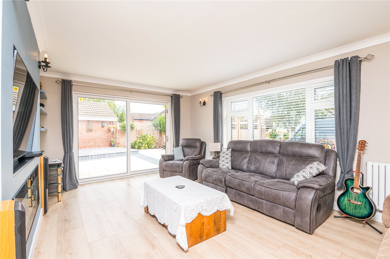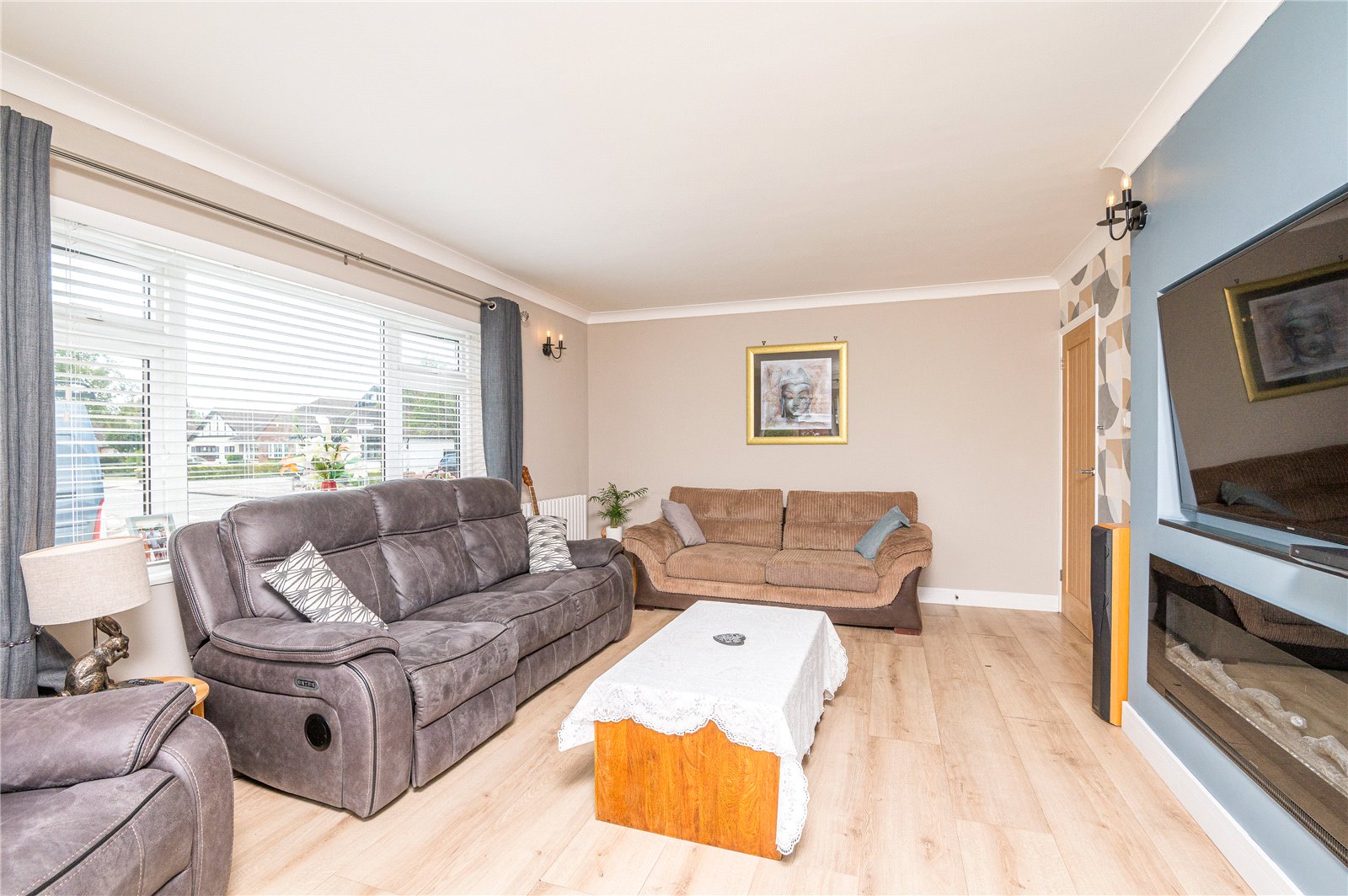 Upvc double glazed sliding patio doors to rear leading on to rear garden. Upvc double glazed window to side. Two wall mounted radiators. Feature media unit with recess for television. Electric mock flame fire. Wood effect laminate flooring. High level skirting. Coved cornice smooth plaster ceiling. Wall mounted lighting.