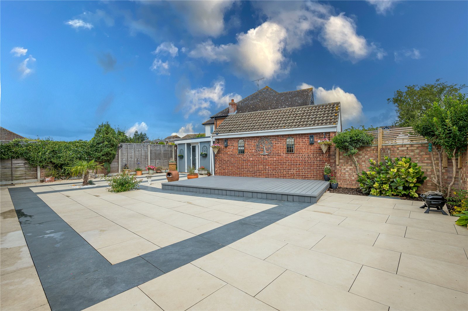 The property benefits from a beautifully landscaped low maintenance rear garden which is mostly laid with porcelain paving slabs and mature planted borders. Large raised composite decking area. Double wooden gates to side. Further side access. Access to home office and garage.