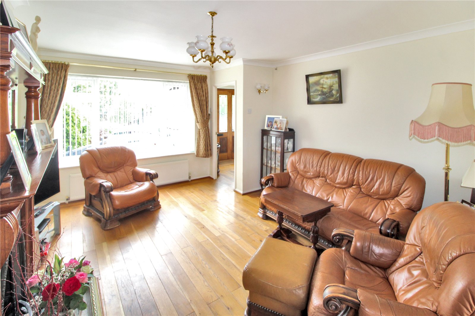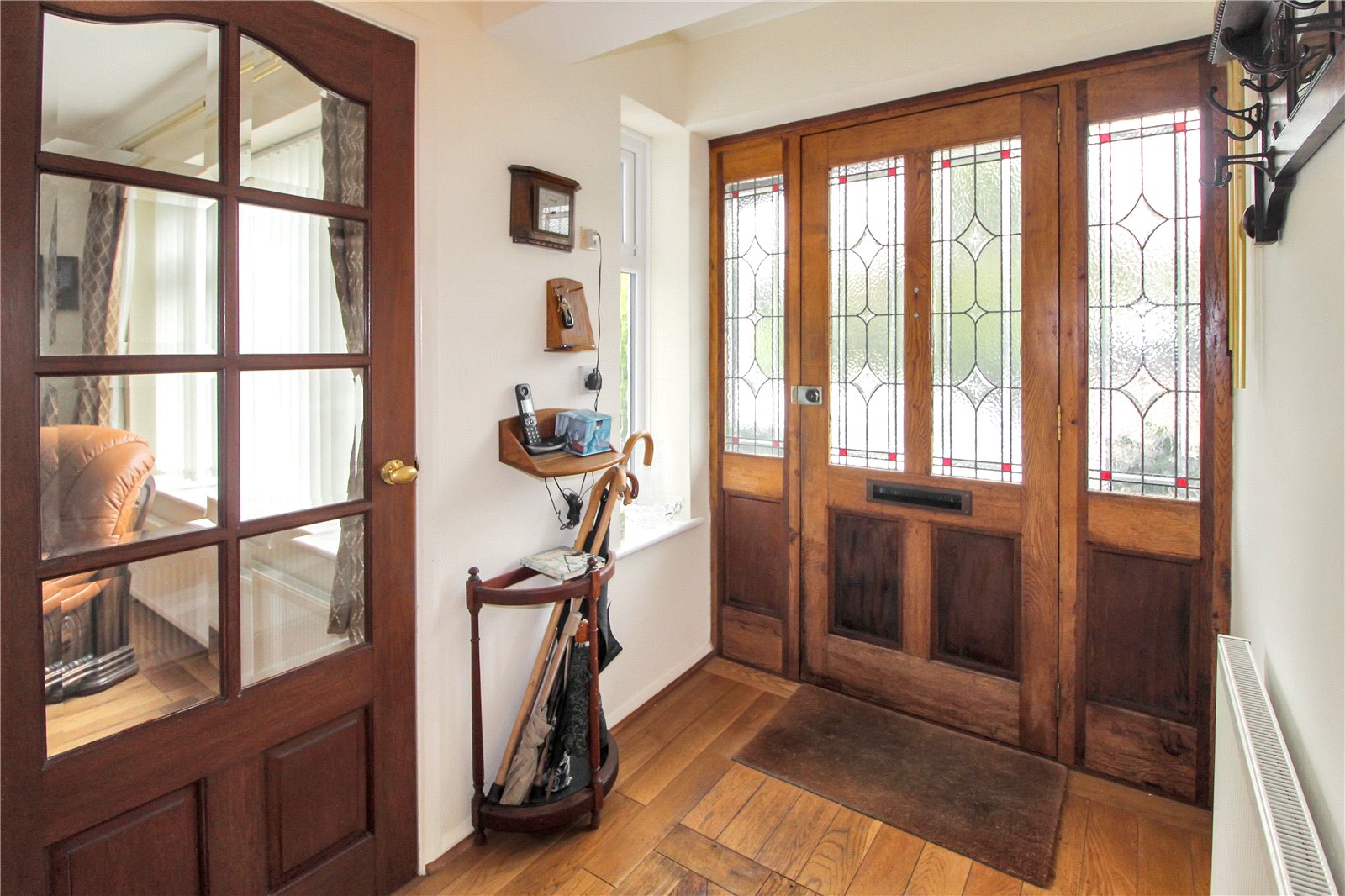 Enter through Double glazed lead light entrance door into hall area, with wooden floor, smooth ceiling, ceiling light, radiator, stairs to first floor and doors to: