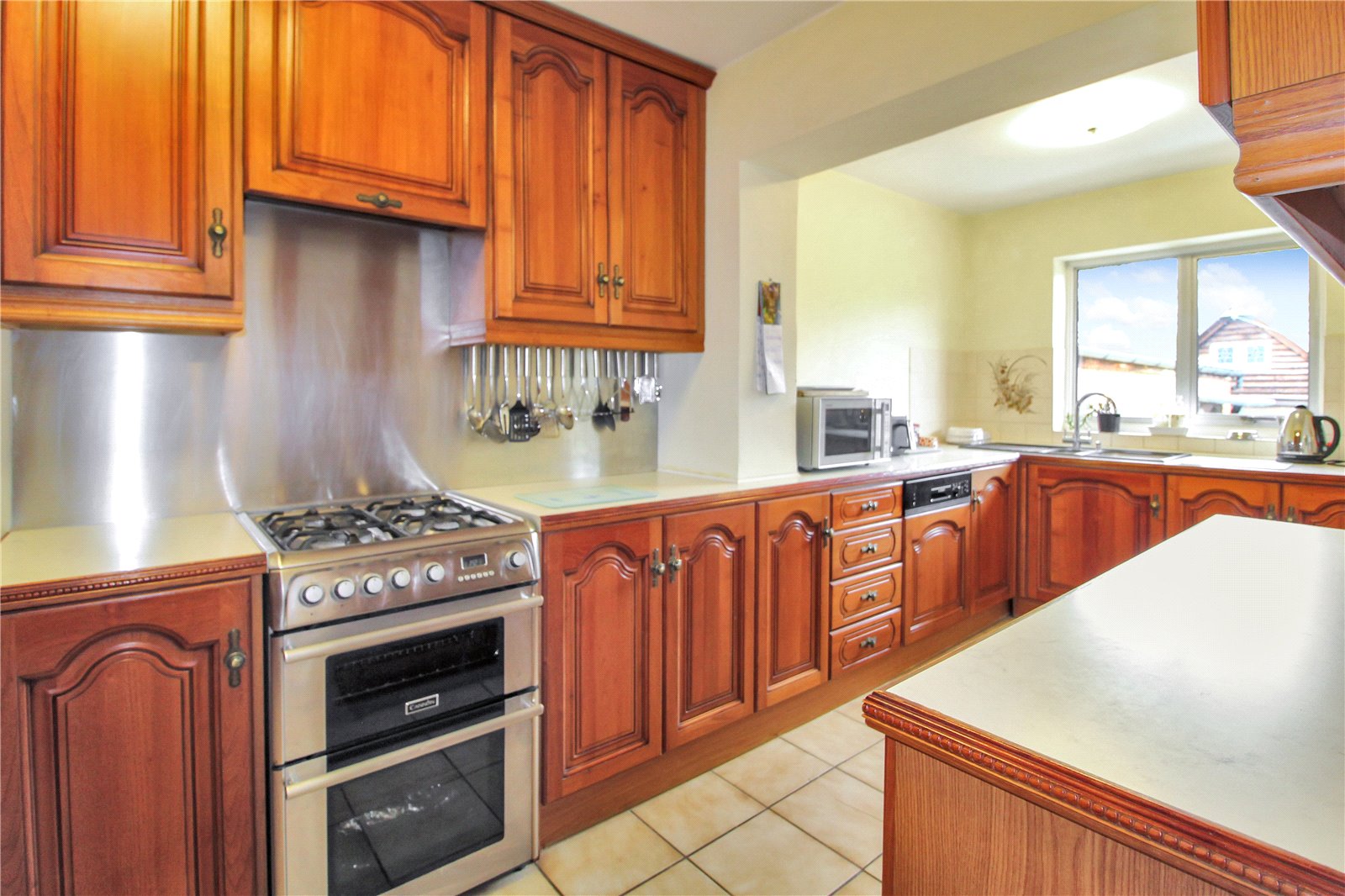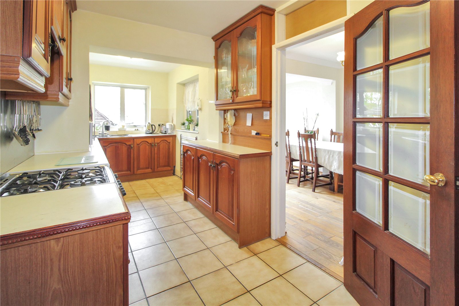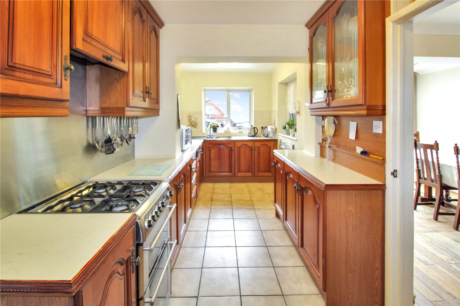 Double glazed window to rear with views of the garden, a range of eye and base level units with integrated Bosch dishwasher, fridge/freezer, with recess for cooker with extractor fan above, built in cupboard housing a combi boiler, sink unit with mixer taps inset to worktop, smooth ceiling, ceiling light, obscure double-glazed door to side leading to carport.
