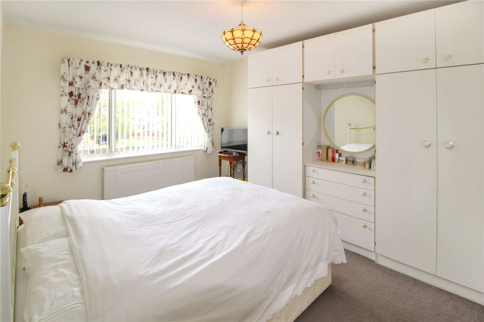 Double bedroom with carpet to floor, smooth ceiling, ceiling light, double glazed window to rear aspect, radiator, fitted wardrobes