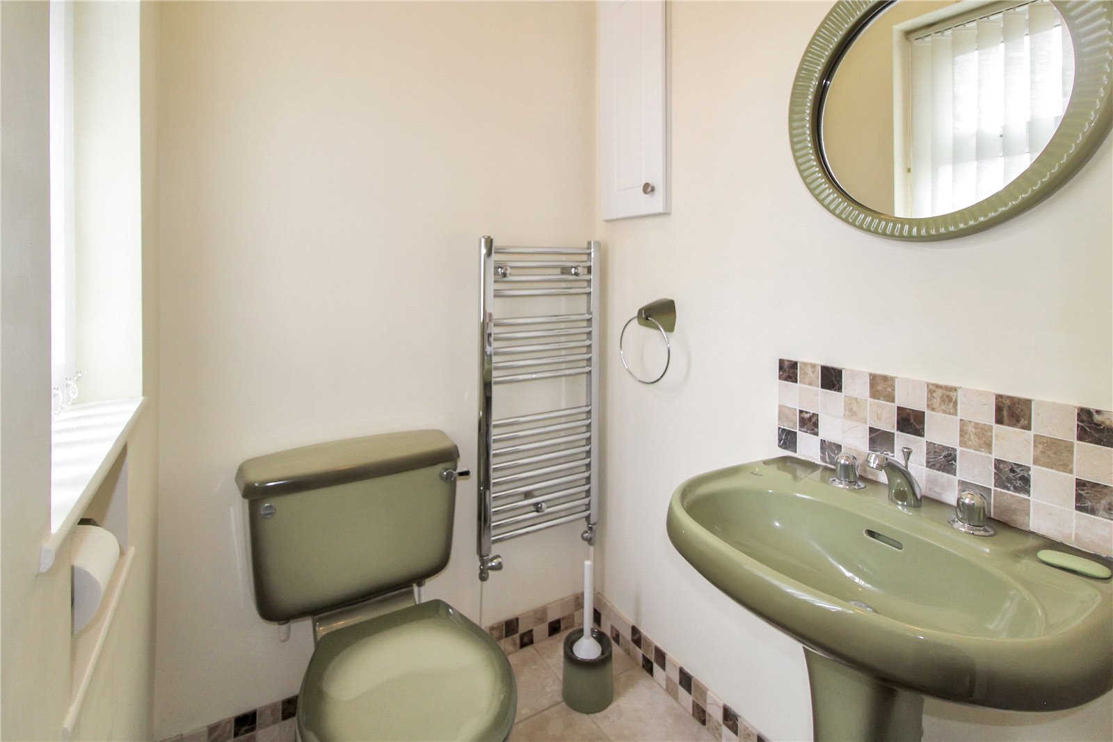 Obscure double-glazed window to side, low flush WC, wash hand basin with mixer taps with tiled splashbacks, towel rail, smooth ceiling, ceiling light.