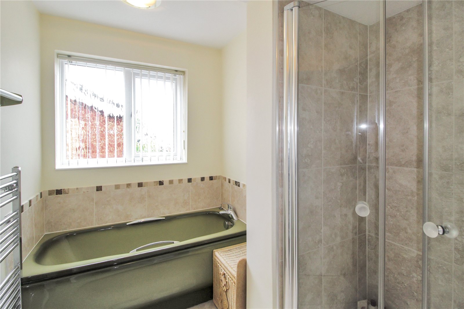 Obscure double-glazed window to side, panelled bath with mixer taps, walk in shower cubicle, heated towel rail, smooth ceiling, ceiling light, wash hand basin with mixer taps and tiled splashbacks.