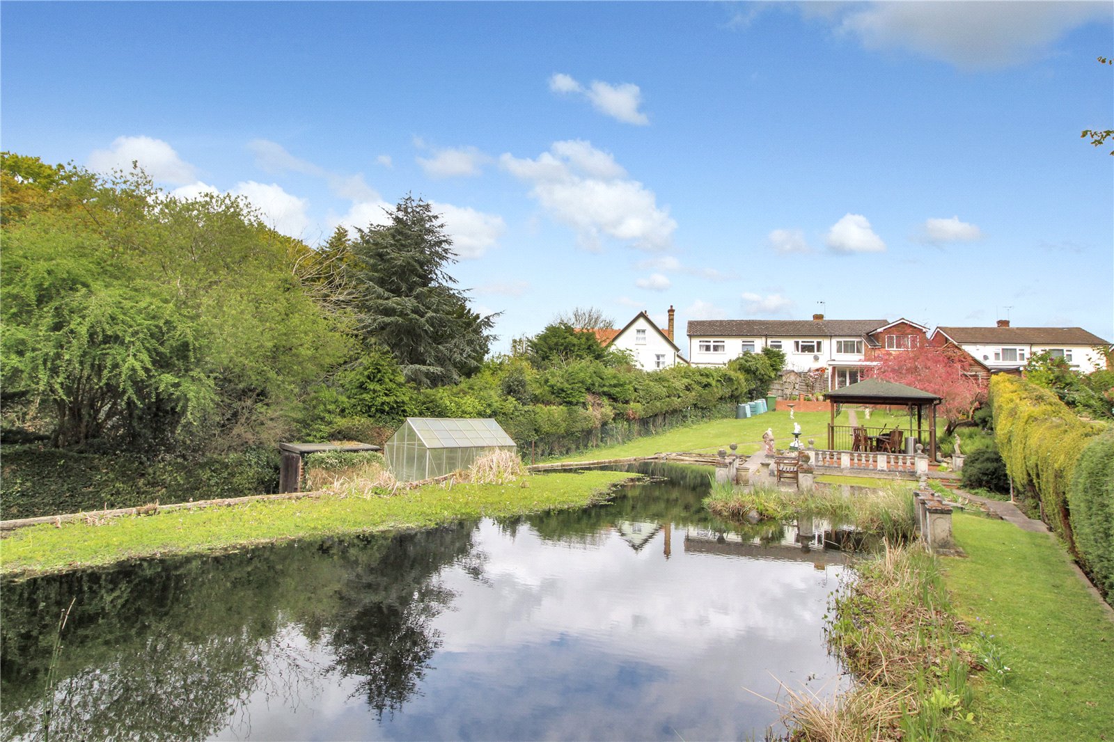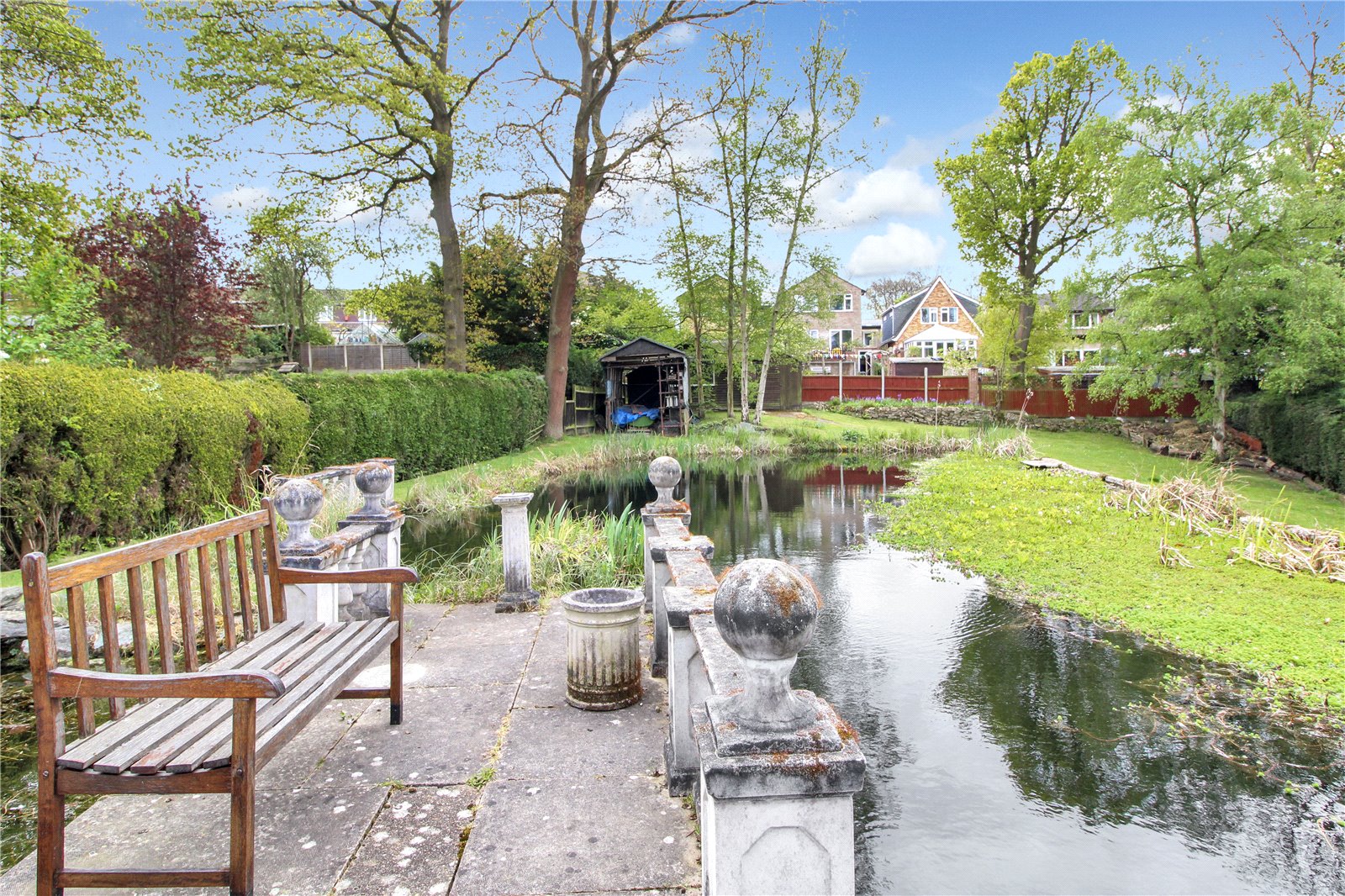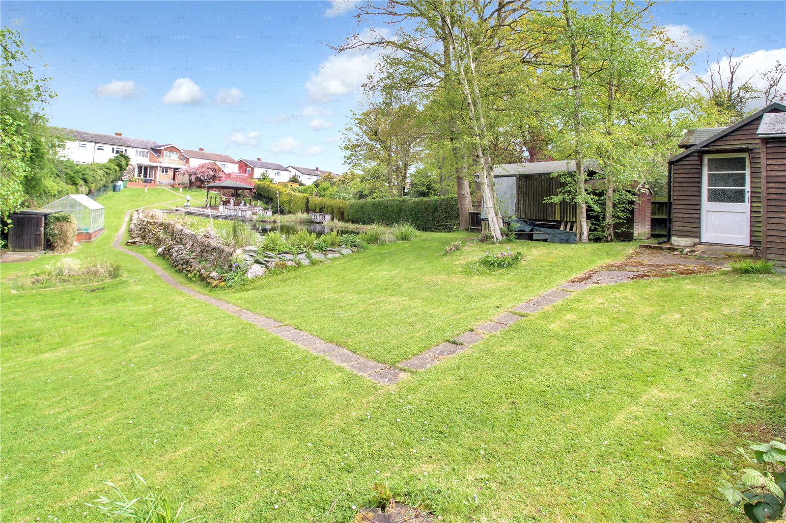 A beautiful tranquil 'park like' south facing rear garden measuring approx. 320' in length. Commencing with a patio area, with side access to car port and garage. Mostly laid to lawn with large pond. There is an additional outbuilding which would make a good office or workshop measuring 17'9" x 11'1", wrought iron gates at beginning of garden leading back through to front driveway.