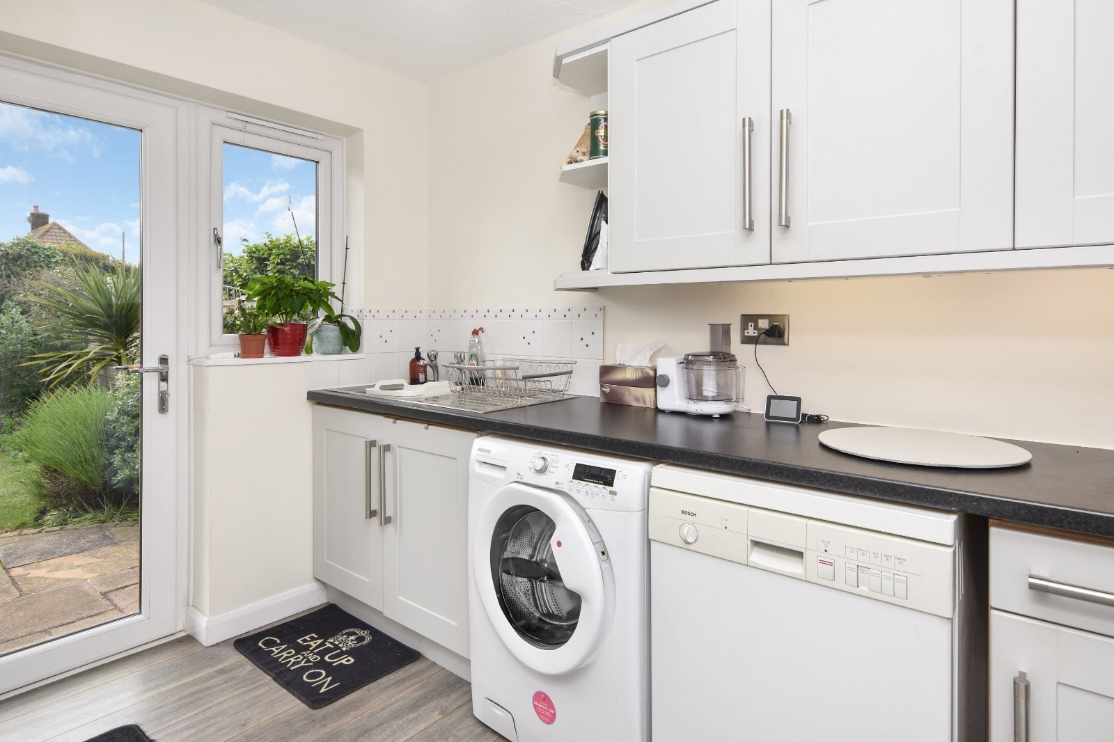 A bright and practical space with a uPVC double glazed door and matching window opening onto the rear garden. Fitted with coordinating eye and base level cabinetry with rolled-edge work surfaces incorporating a stainless steel single drainer sink unit. Generous under-counter appliance space is provided, along with the floor-mounted Ideal Mexico boiler. Additional features include splashback tiling, under-unit lighting, laminate wood-effect flooring, ladder-style heated towel rail and coving to a smooth plastered ceiling.