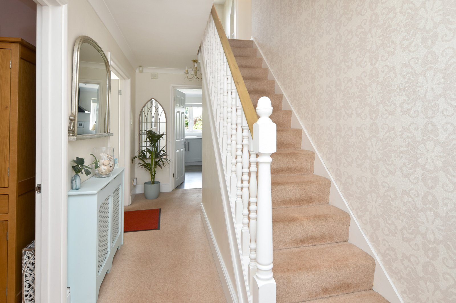 To the first floor, a spacious galleried landing provides access to eaves storage and loft space via a pull-down ladder. All four bedrooms are comfortable doubles, with the principal bedroom benefiting from quality fitted wardrobes and a modern en-suite shower room. The rear bedrooms feature large skylight-style windows offering attractive rooftop views towards the Thames Estuary. A contemporary family bathroom completes the accommodation.